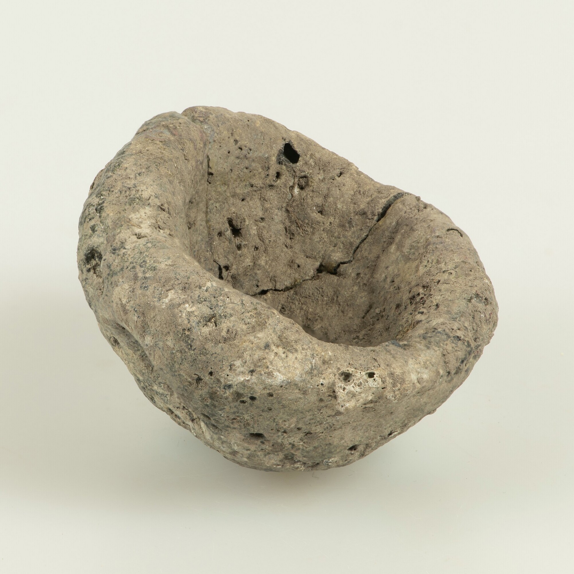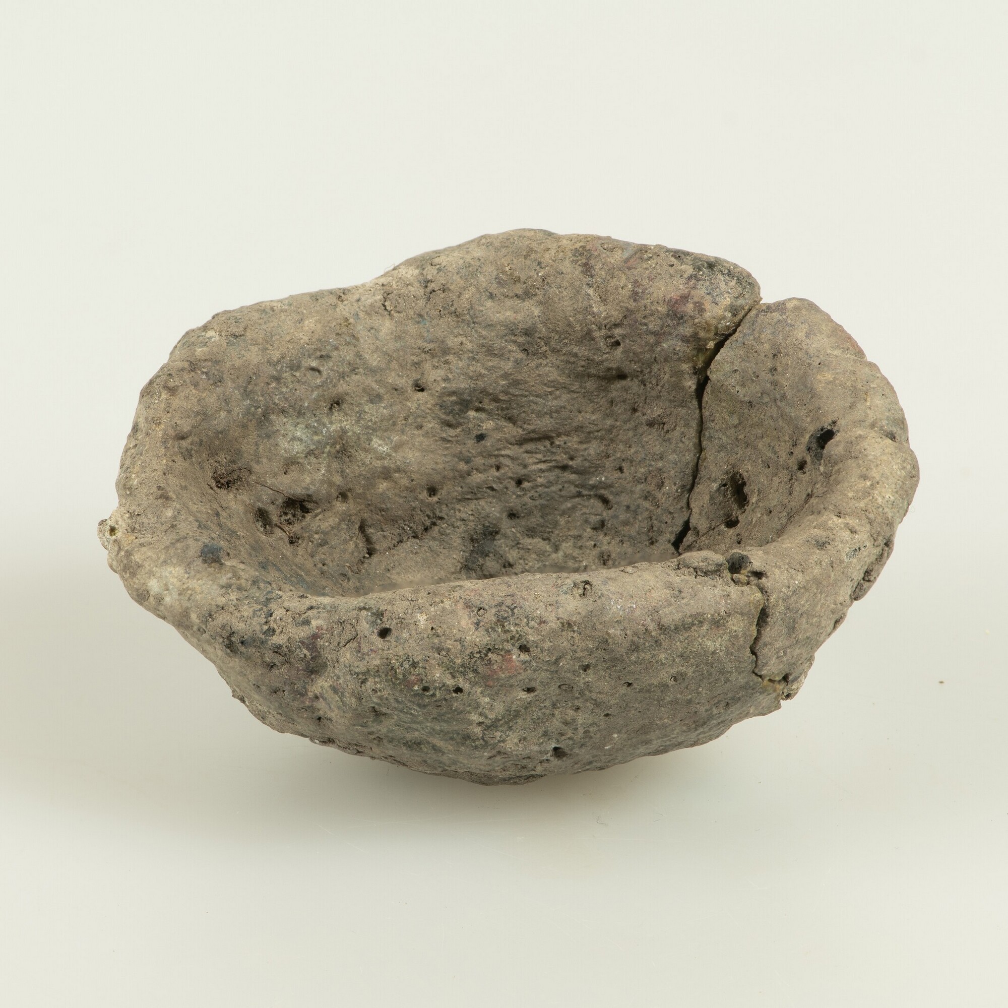 Smeltkroes; handgevormd aardewerk; ovaalvormig; verglaasd oppervlak