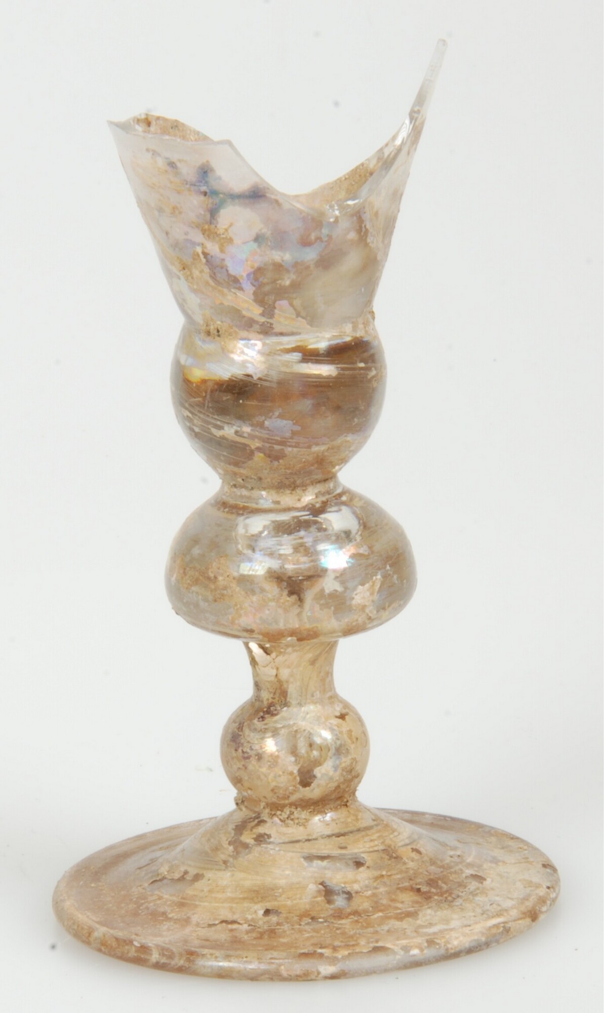 Kelkglas; gl-kel-7; kleurloos glas; luchtbel in stam; pontilmerk voet; rand kelk ontbreekt, stam met drie geledingen en luchtbel, omgeslagen voetrand