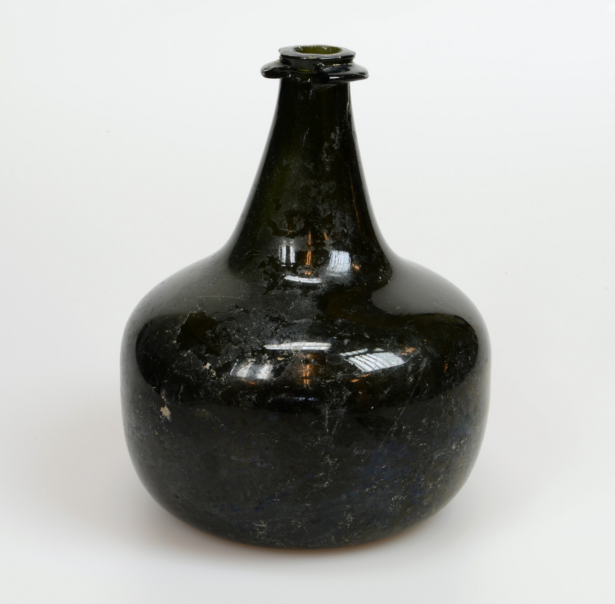 Wijnfles:hoge hals, opgebolde bodem