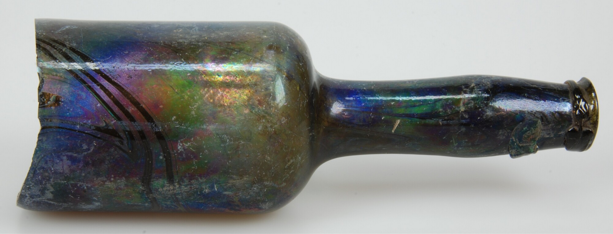 Fles; gl-fle-39; dikwandige cilindrische wijnfles met 'ladies legg hals', glasdraadversteviging rond hals; donkergroen glas; bodem ontbreekt, geknikte schouder