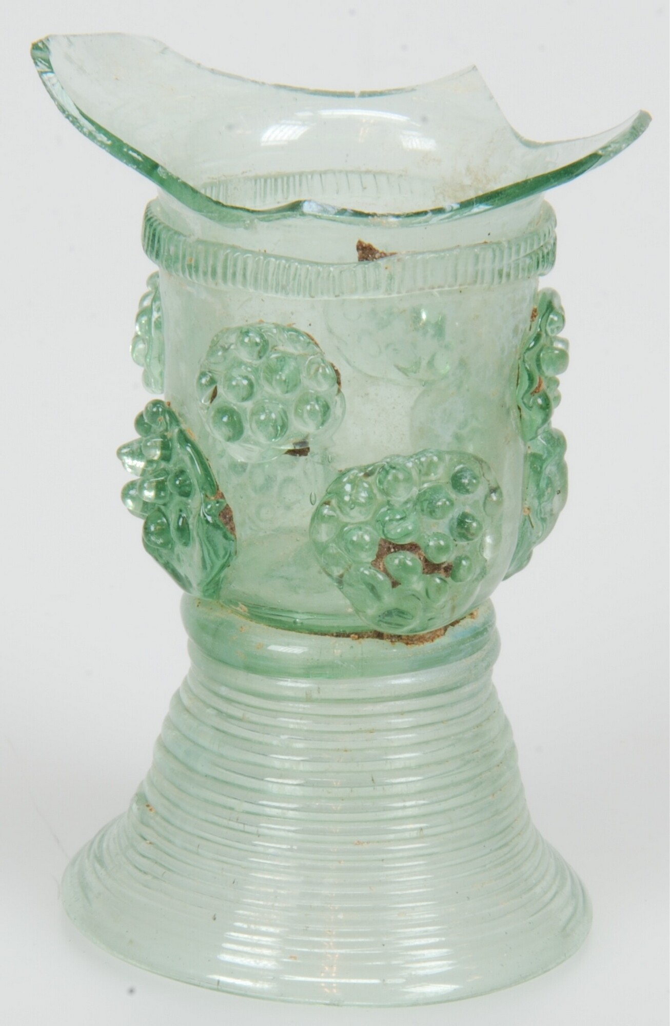 Roemer; gl-roe-2; groen glas; gewonden glasdraadvoet; cuppa ontbreekt, twee rijen braamnoppen op een conische schacht, hoge gewonden glasdraadvoet met opgestoken bodem en pontilmerk