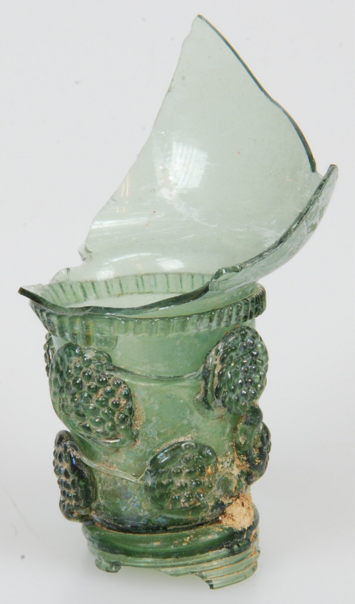 Roemer; gl-roe-2; groen glas; gewonden glasdraadvoet; cuppa ontbreekt, twee rijen braamnoppen op een conische schacht, hoge gewonden glasdraadvoet (fragment) met opgestoken bodem en pontilmerk