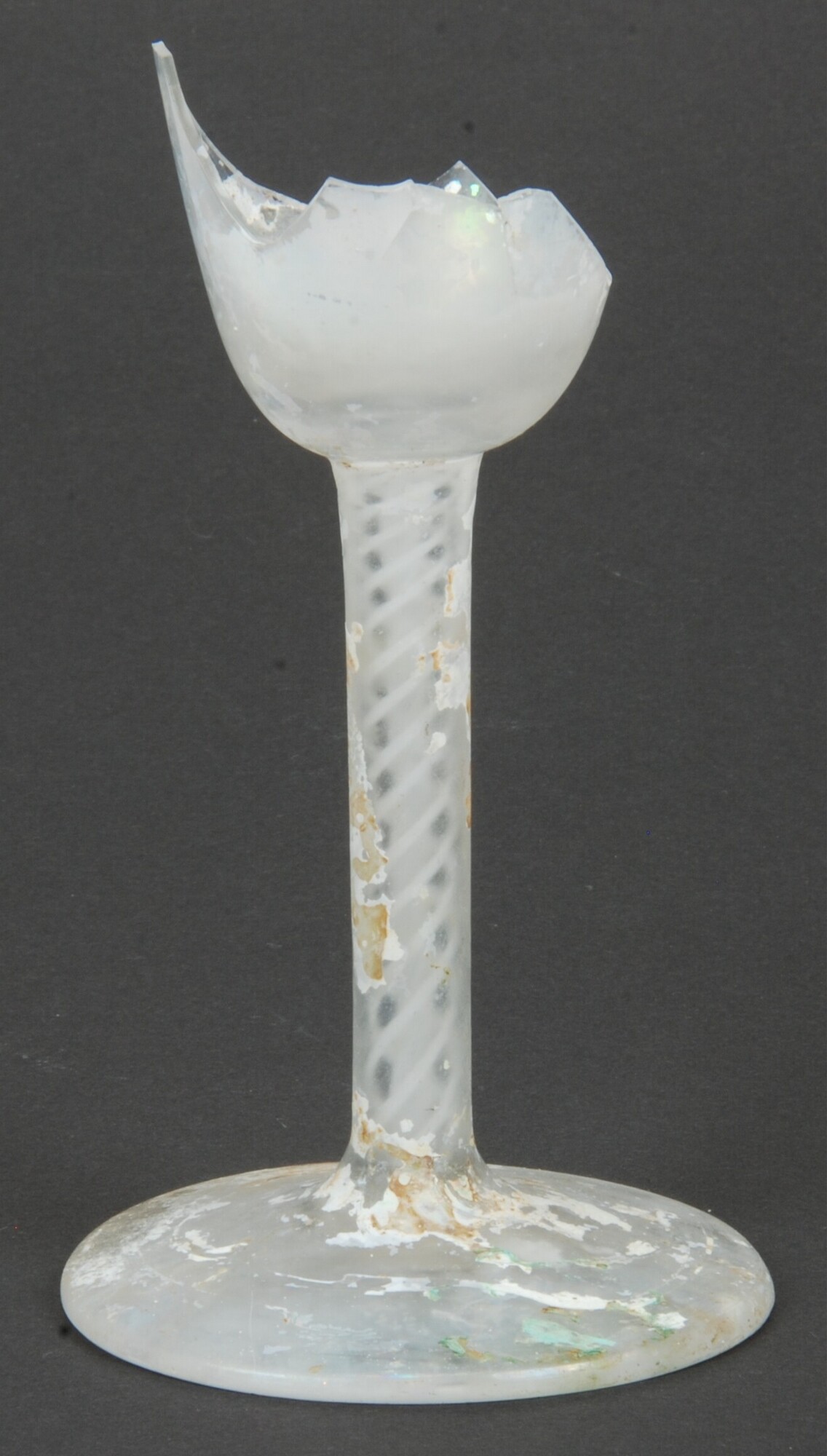 Kelkglas; gl-kel-1; kleurloos/wit glas; geslingerde draden in stam; voet zonder omgeslagen rand; kelk ontbreekt, rechte stam met witte, geslingerde draden