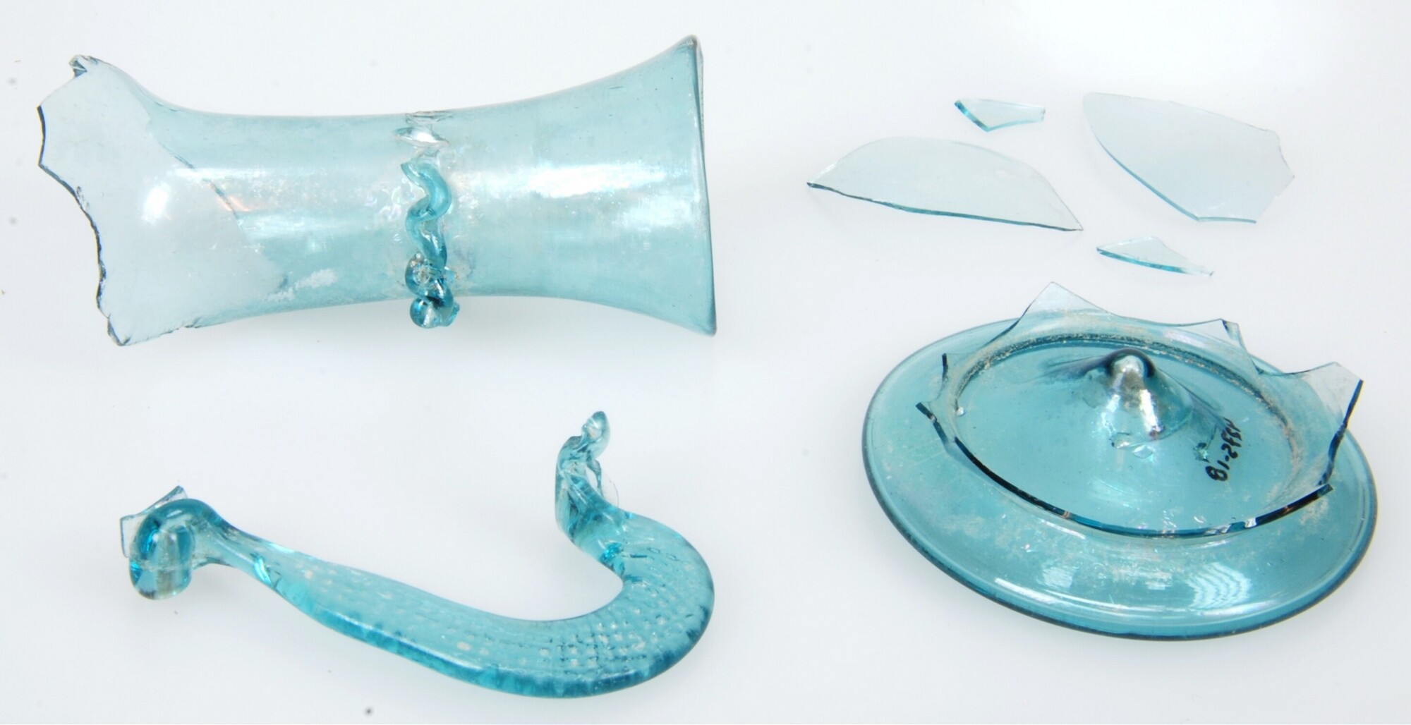 Kan/karaf; gl-kan-3; lichtblauw glas; opgestoken voet met omgeslagen rand met pontilmerk; met tang platgeknepen oor; buik ontbreekt