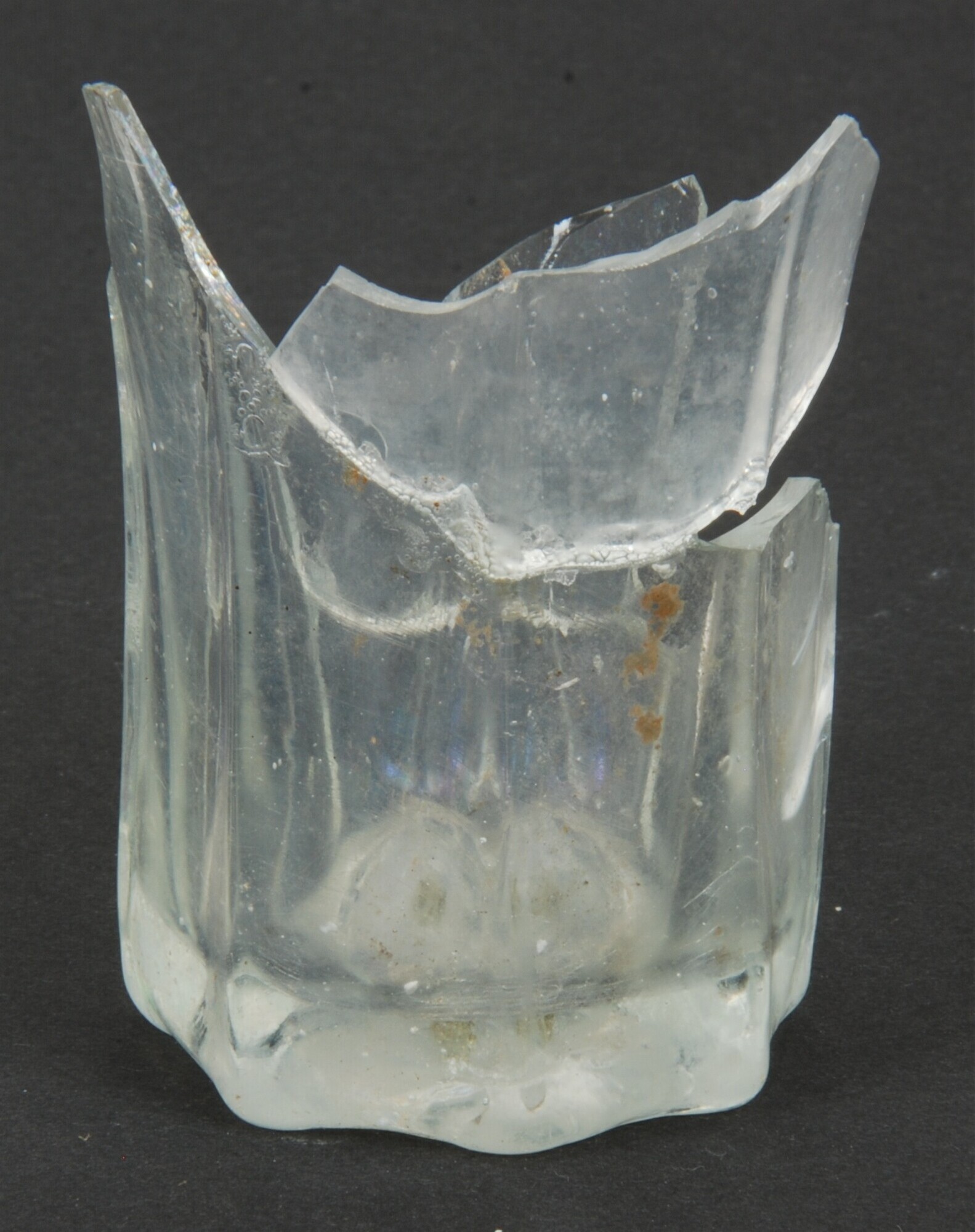 Beker; gl-bek-58; kleine beker met verticale ribben bij de mond, rand iets uitlopend; kleurloos glas; verticale ribben; bodem licht opgestoken met pontilmerk