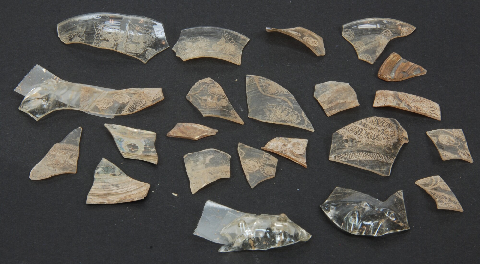 Kelkglas; gl-kel-?; kleurloos; diamantgravures, mezza stampaura techniek (uitgetrokken punten); trechtervormig kelkglas met aan de onderzijde van de kelk uitgetrokken punten