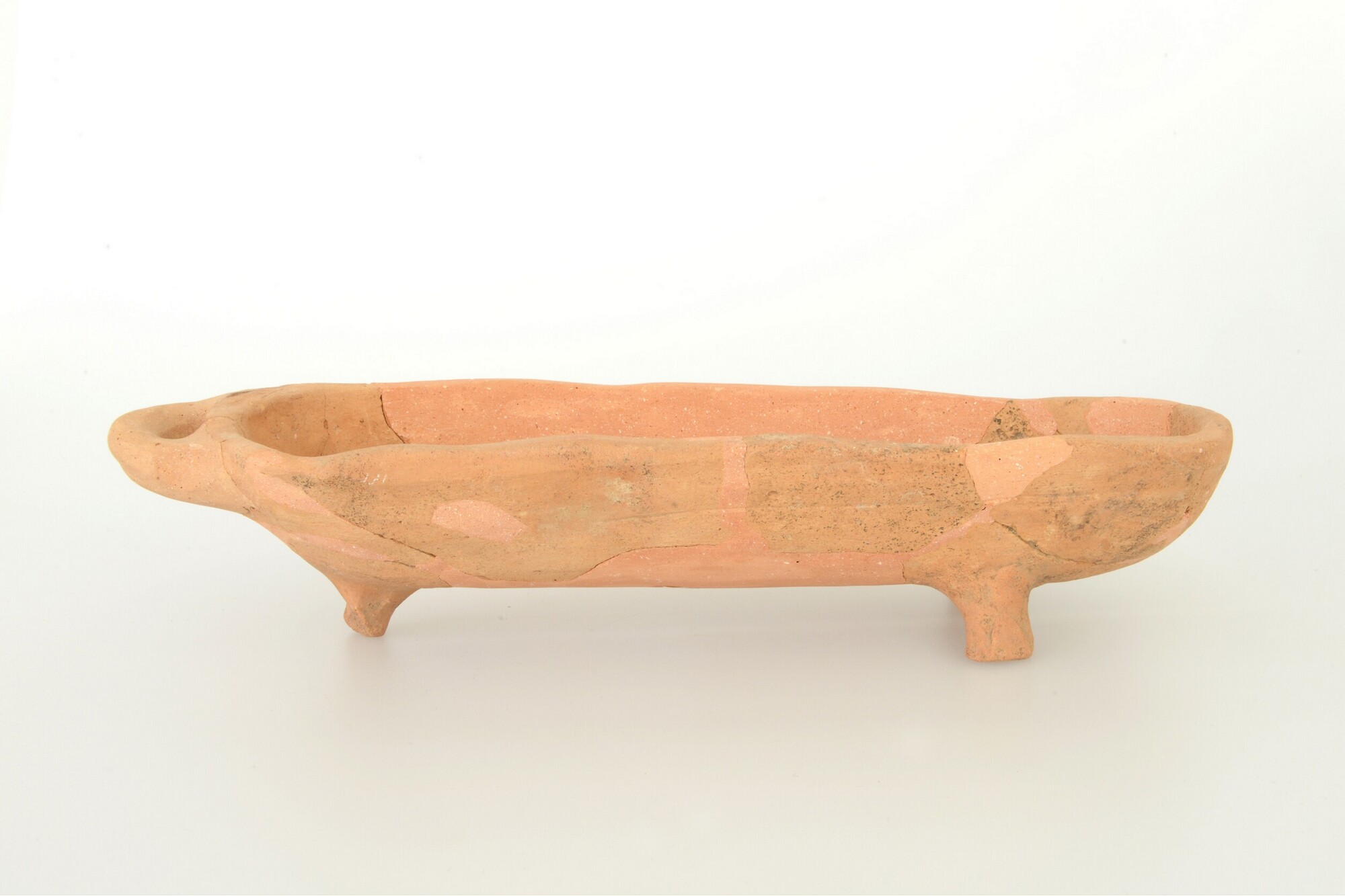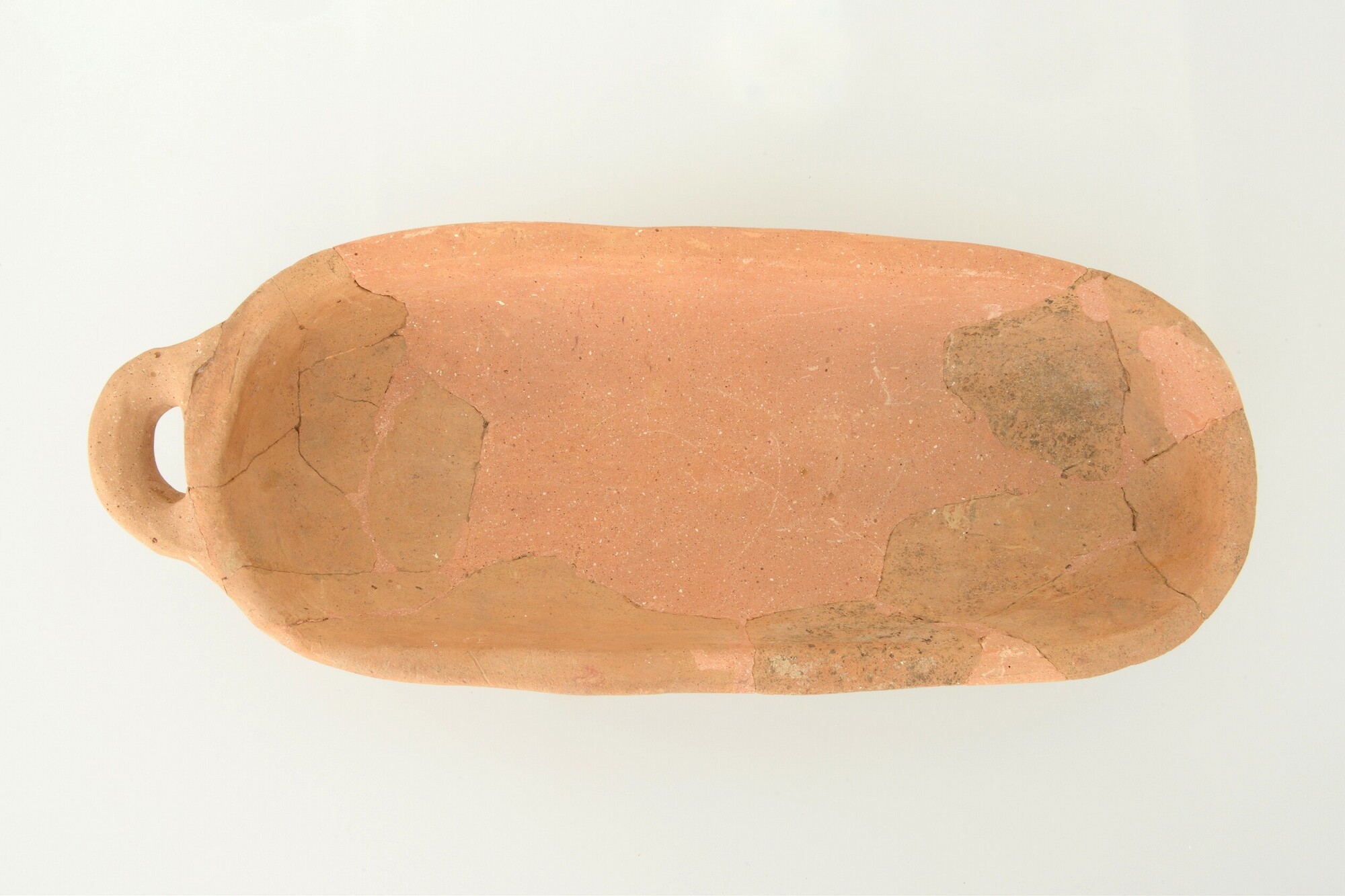 Bak; r-bak-; roodbakkend; langwerpige, ondiepe, smalle bak; halffabrikaat, biscuit; één horizontaal worstoor; drie poten; productieplaats: Enkhuizen