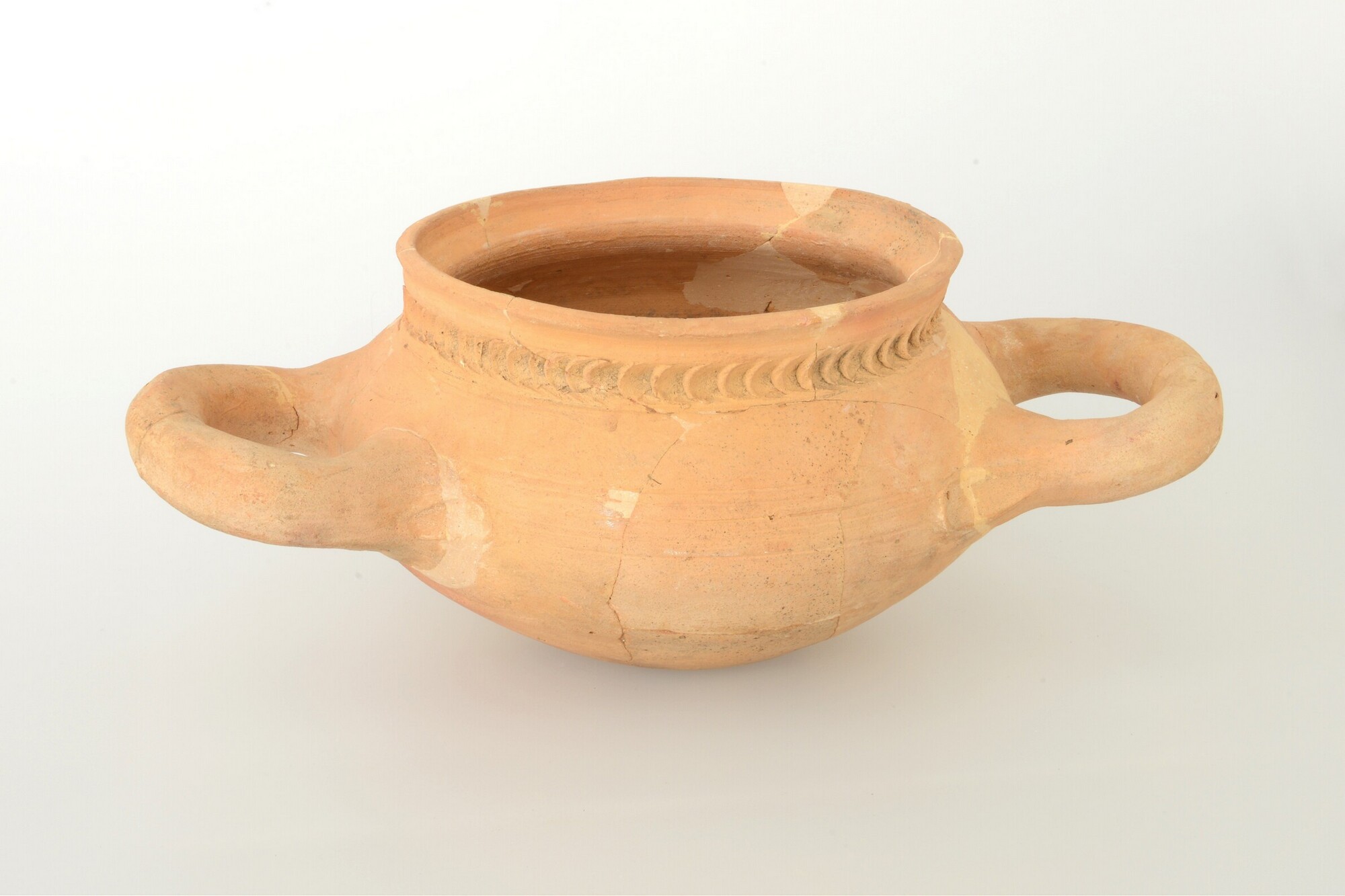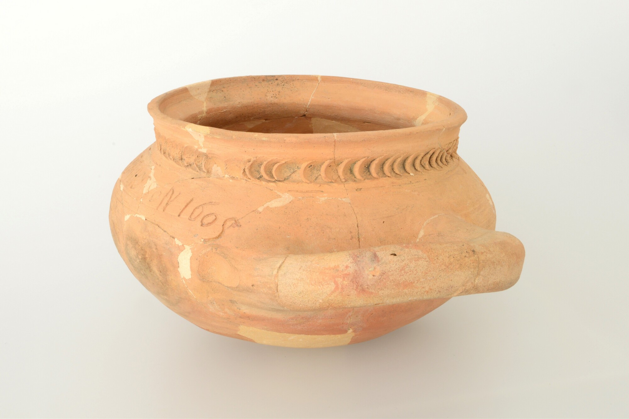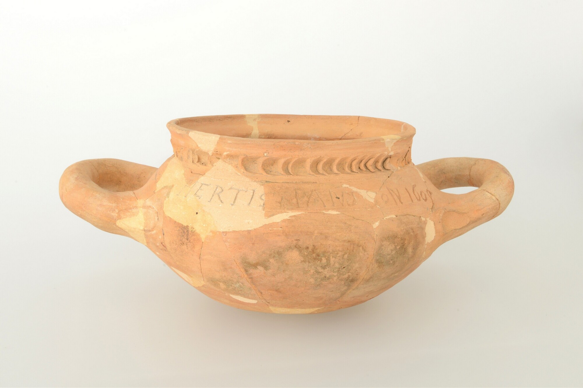 Mengpot; r-pot-; kalebasvormige pot; roodbakkend aardewerk; ongeglazuurd; twee horizontale worstoren; standvlak; inwendig grijze aanslag loodoxide; tekst op buik: H...G IANSSON 1605; productieplaats: Enkhuizen
