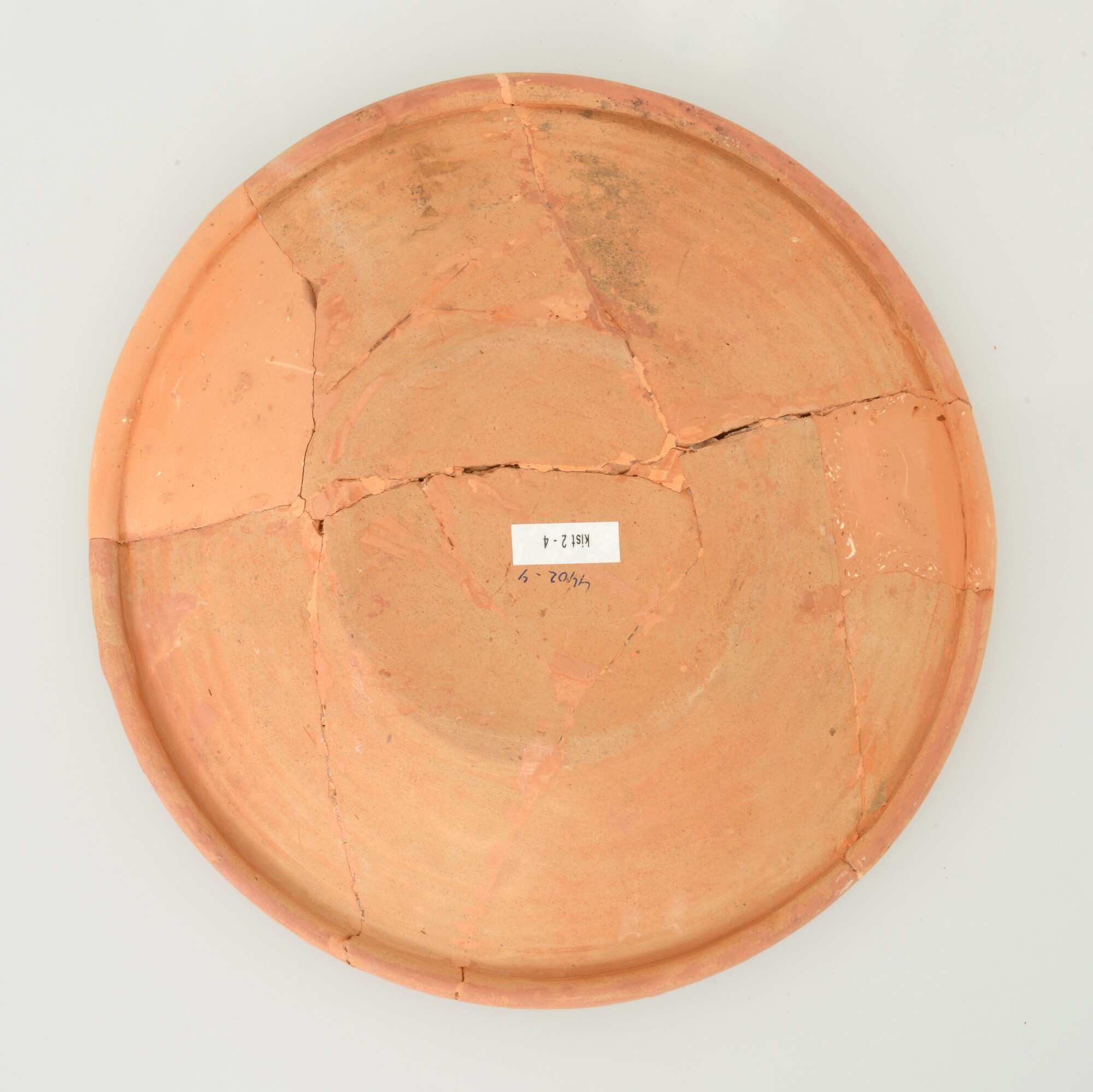 Schotel; wa-bor-1; roodbakkend; halffabricaat, biscuit; slibversiering, slib-krastechniek; vlag: concentrische cirkels, ornamentbanden, spiegel: leeuw?; standvlak; productieplaats: Enkhuizen