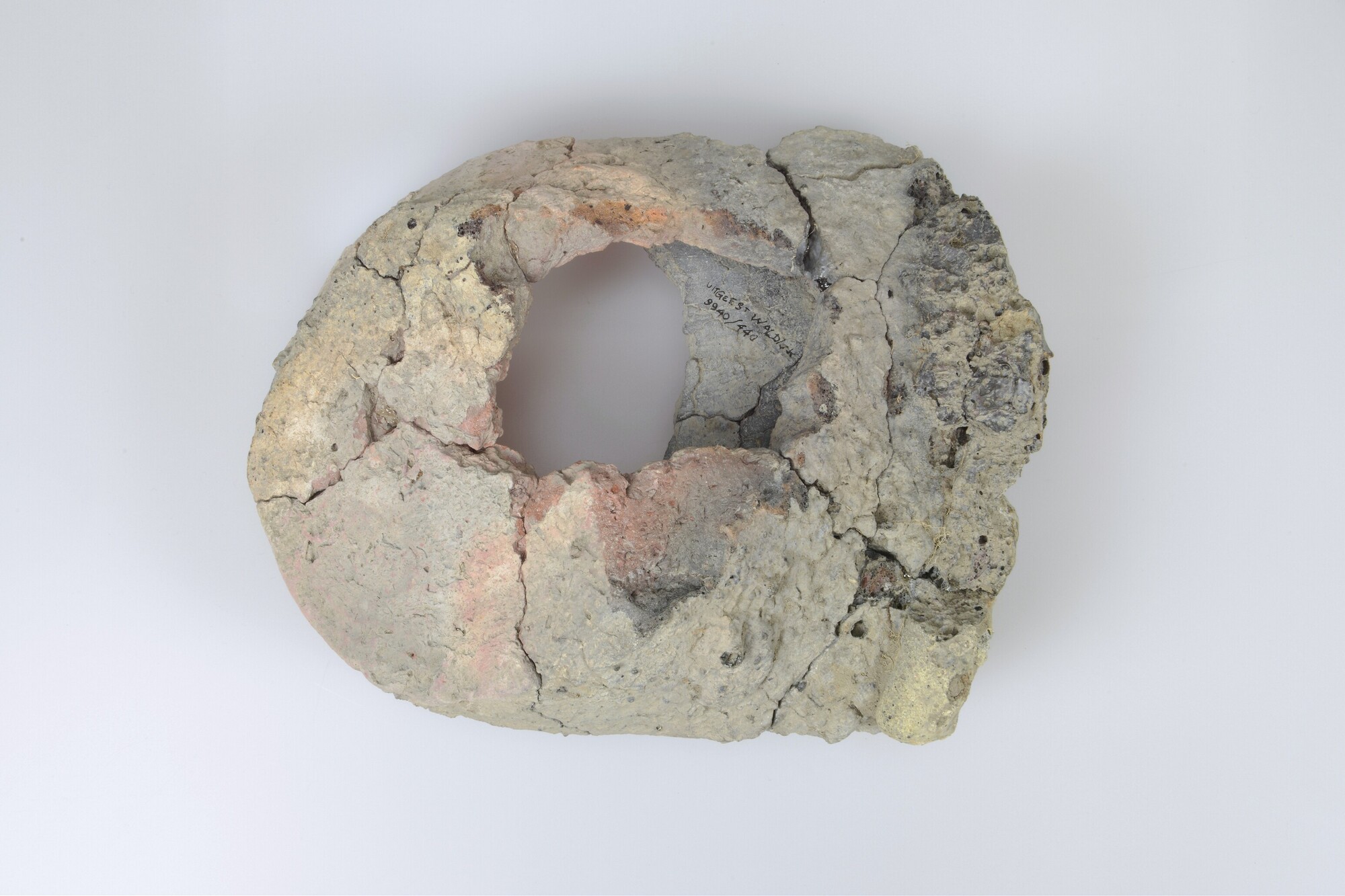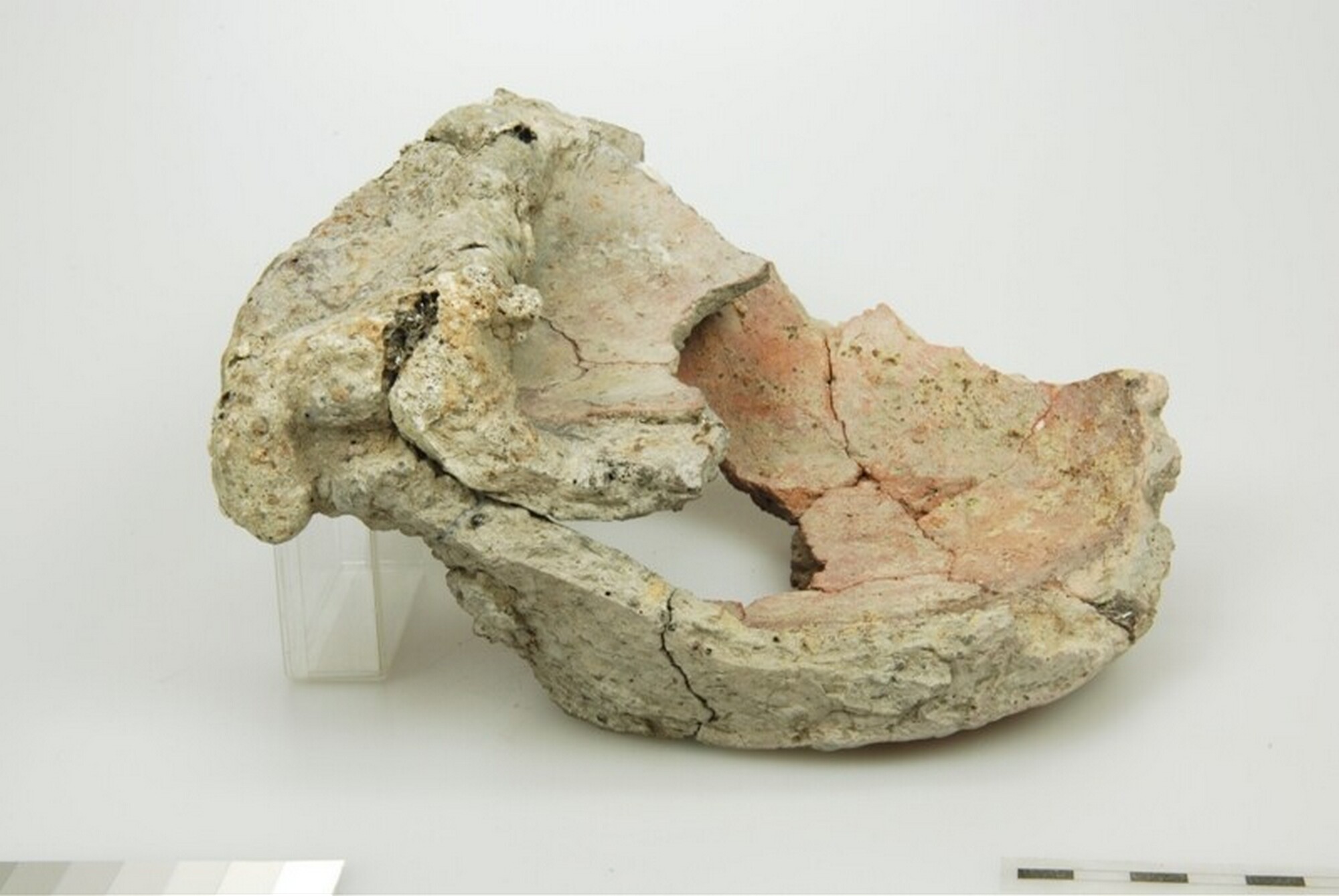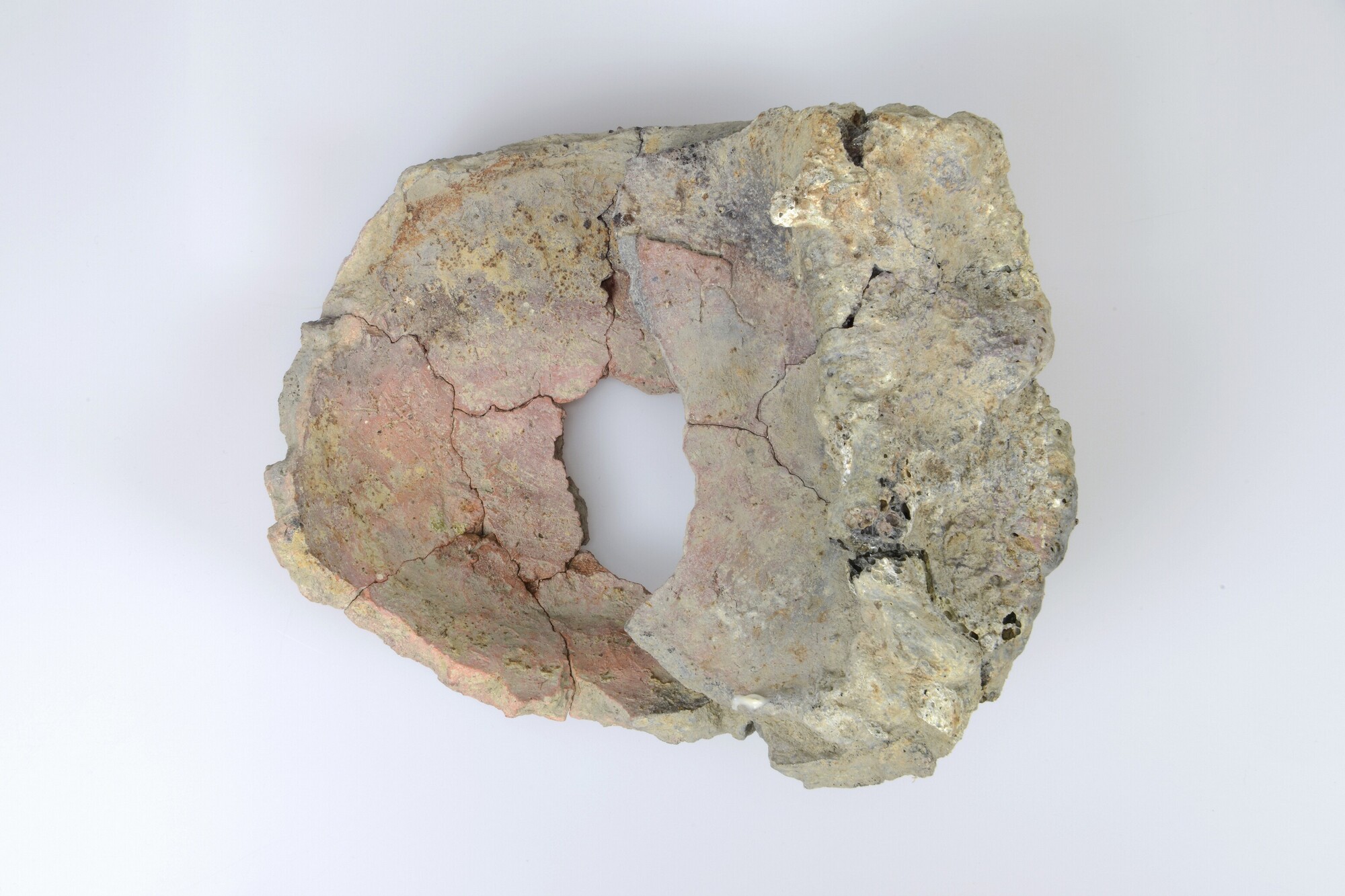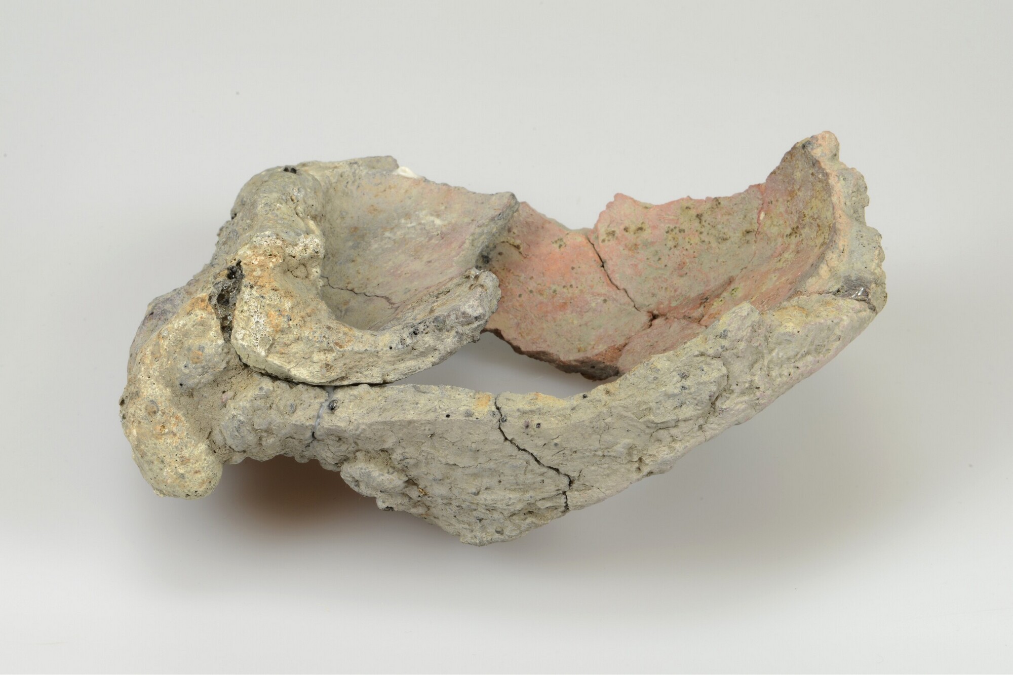 Pot; misbaksel; twee aan elkaar versinterde bodemfragmenten van potten; inheems-romeins aardewerk; vondstomstandigheden: sloot, Assummervaart