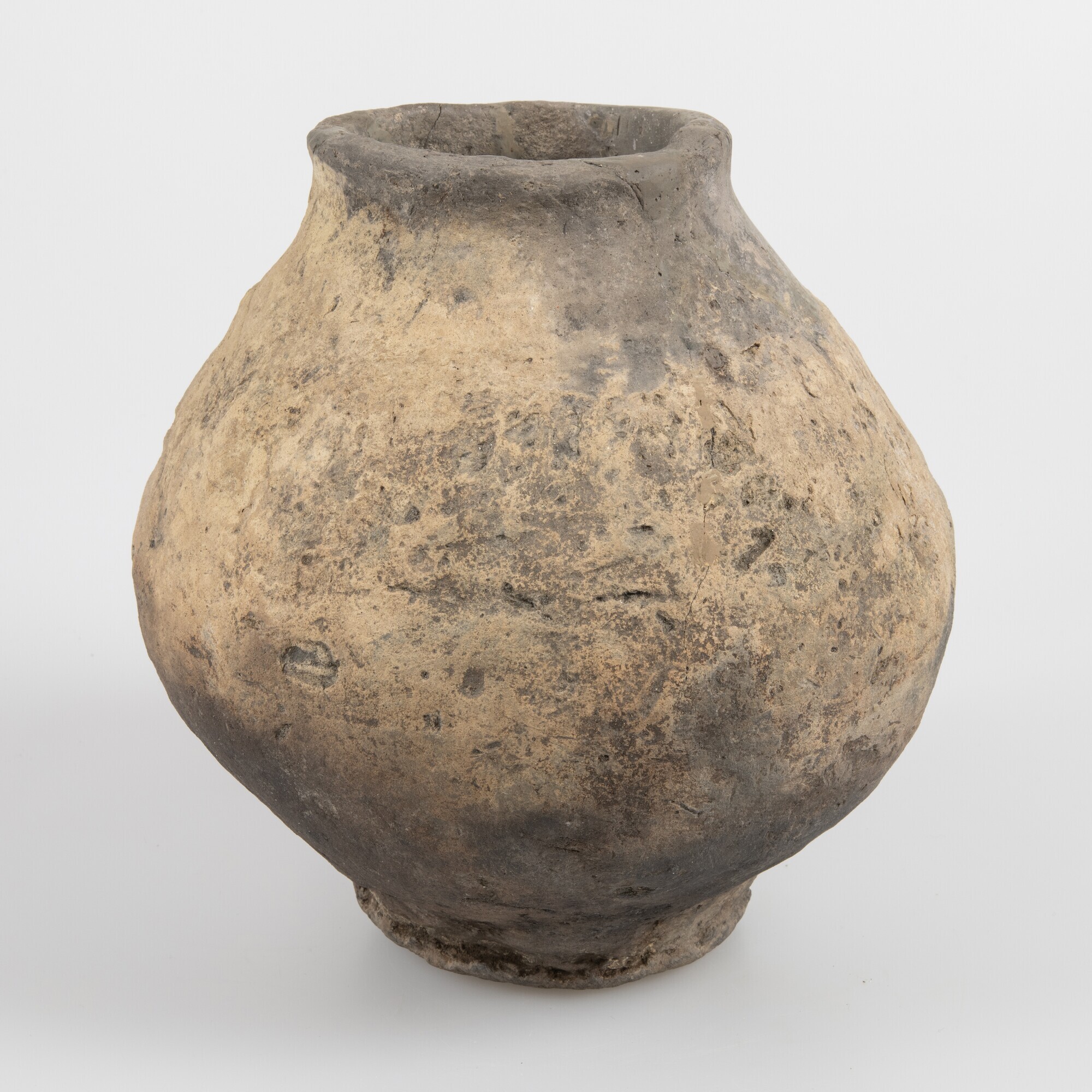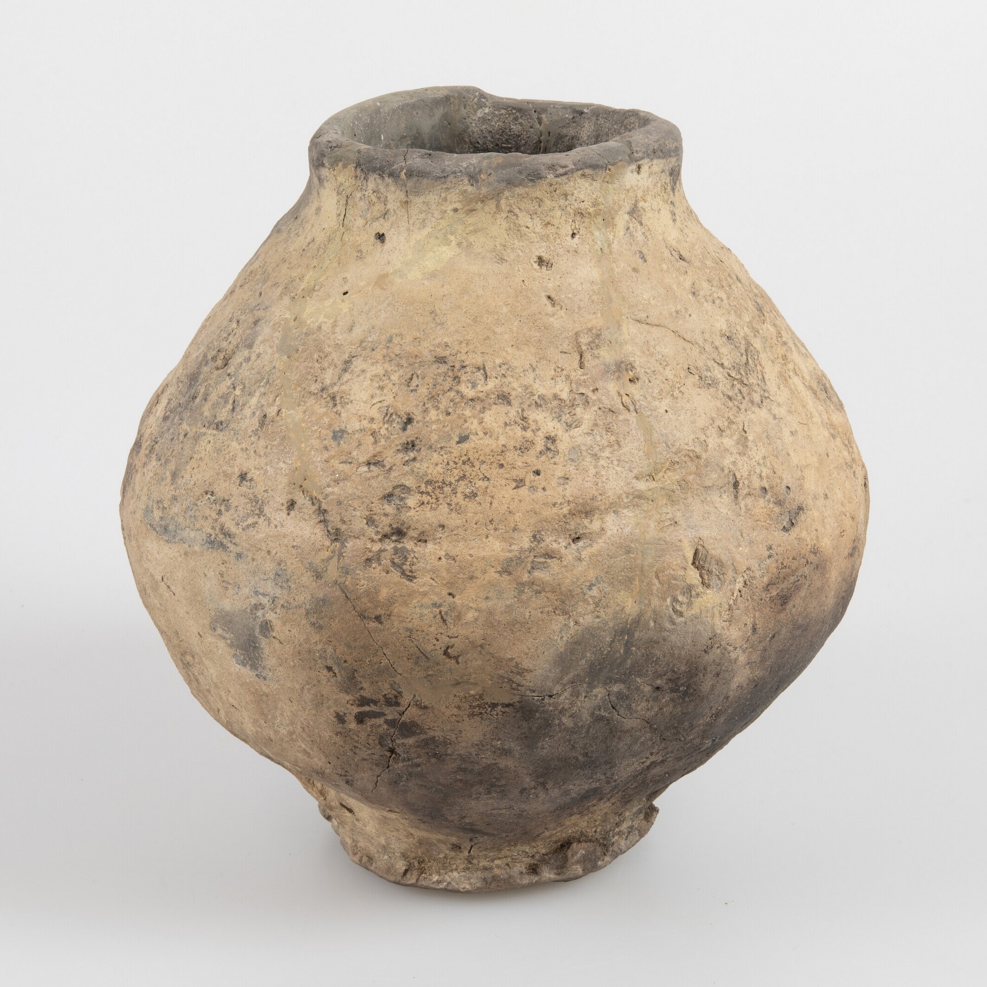 Pot; type Diederik F-III (?); inheems-Romeins aardewerk; nauwmondige bolvormige pot met aan de onderzijde een driehoekige indruk die doorloopt tot aan de binnenzijde; smalle voet