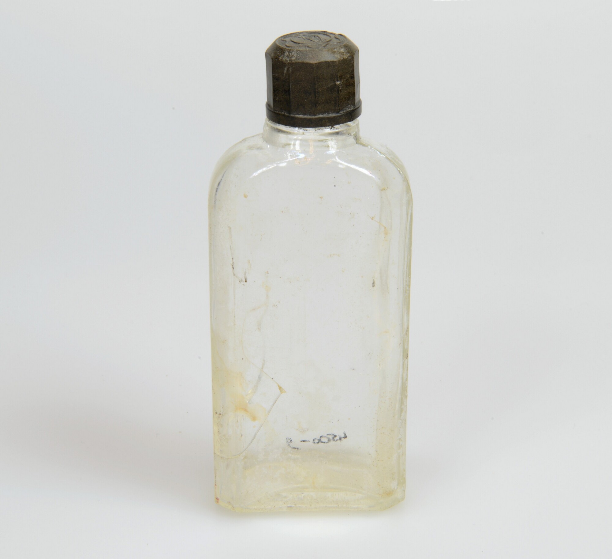 Fles; gl-fle-59; rechthoekige fles met afgeschuinde hoeken, cilindrische hals met schroefdraad en afgeronde schouder, contactvorm met naden, standvlak; kleurloos glas; bakelieten dop
