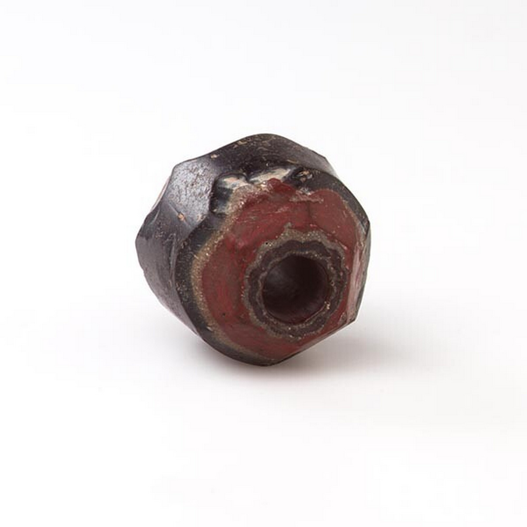 Chevron-kraal; ovale glazen kraal opgebouwd uit zeven lagen gekleurd glas, gat in het midden, van binnen naar buiten rood, wit, rood, wit, rood, wit, donker blauw, de uiteinden zijn zeskantig afgekapt; herkomst: vermoedelijk Amsterdam of mogelijk Venetië, Italië; vondstdatum: 12-11-1935