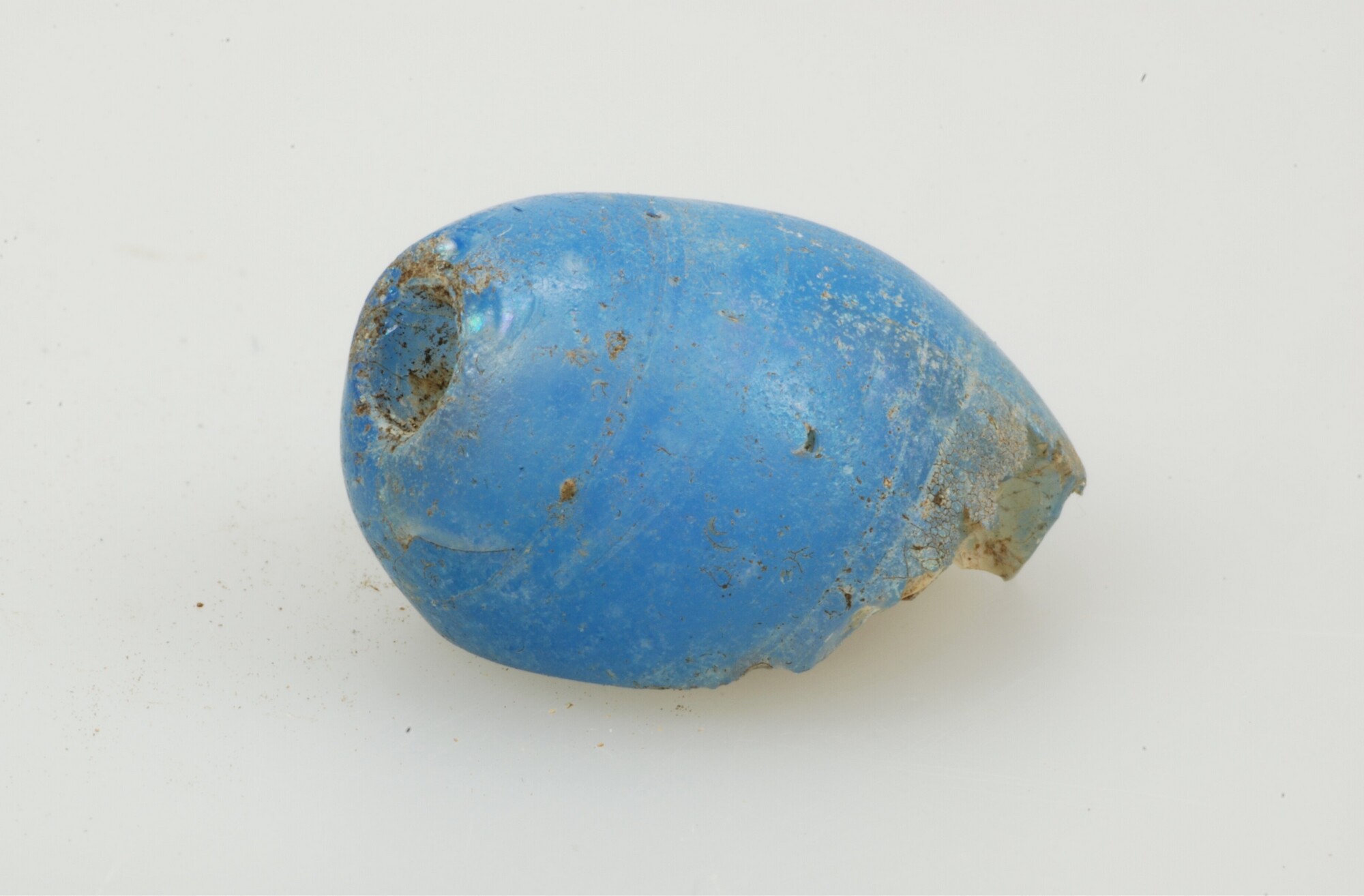 Kraal (fragment); kobaltblauw glas; ovoïde met doorboring; herkomst: Bohemen of Beieren