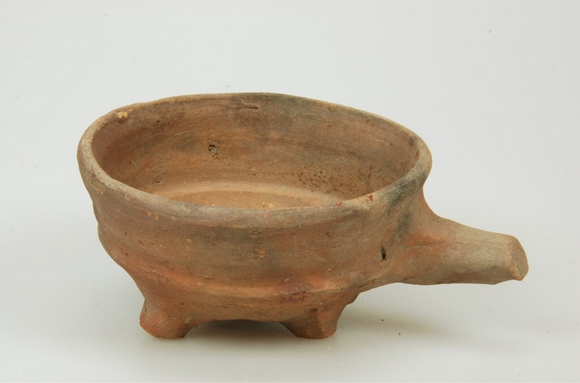 Test; r-tes-1; roodbakkend aardewerk; inwendig spat glazuur; drie poten; steel; herkomst: Nederland