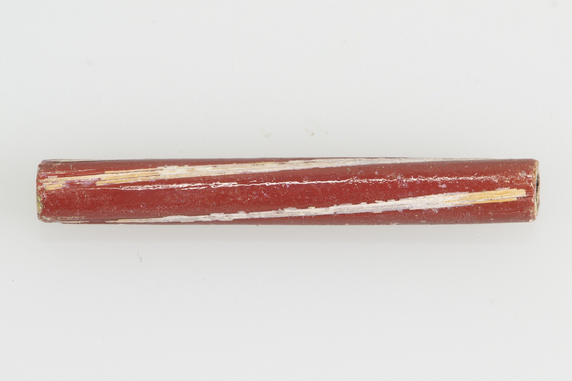 Kraal; langwerpige kraal van rood glas met witte strepen; vermoedelijk een halffabrikaat; herkomst: waarschijnlijk Amsterdam