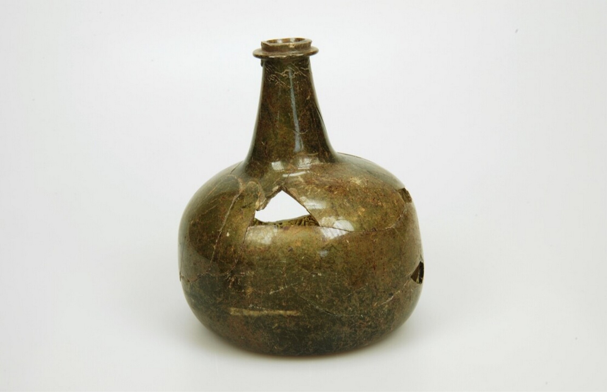 Wijnfles:hoge hals, opgebolde bodem