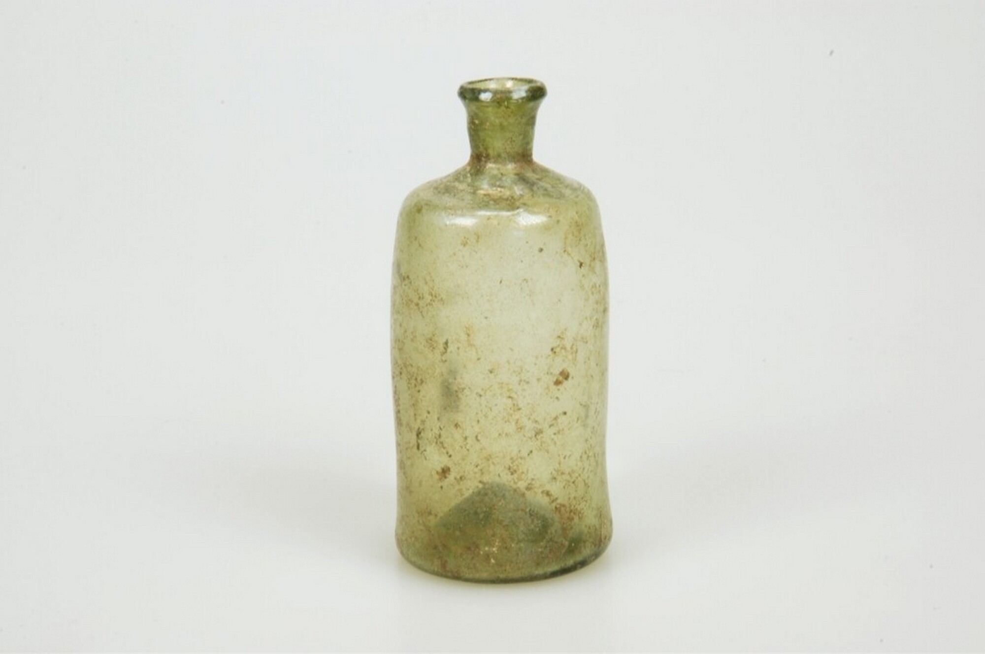 Medicijnfles: gl-fle-11; groen; opgestoken bodem met pontilmerk; herkomst: Nederlanden of Duitsland?