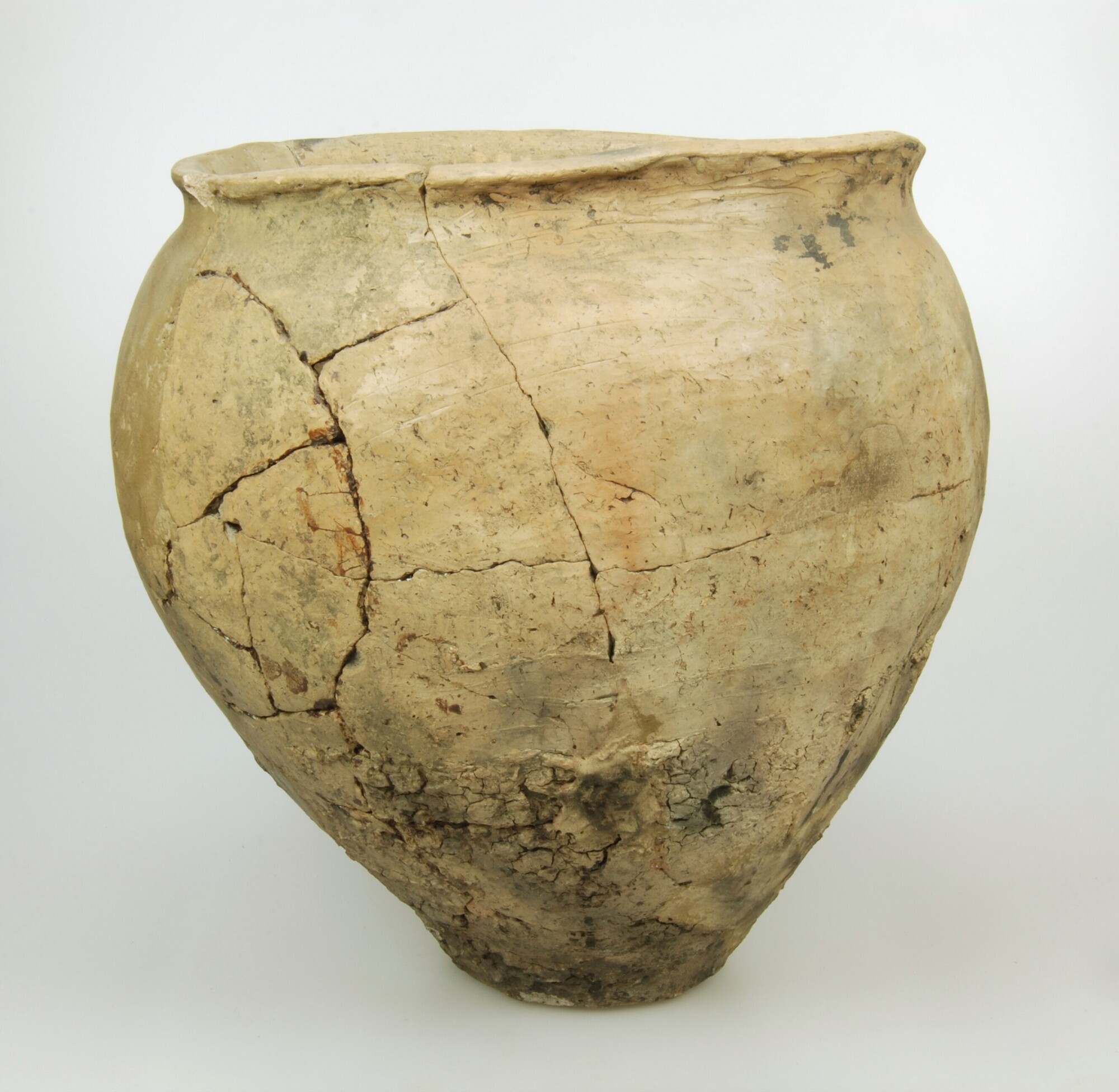 Pot; handgevormd inheems aardewerk; standvlak; bolle wand, besmeten