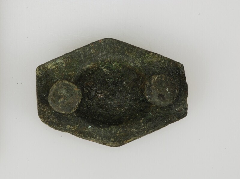 Beslag; vulva beslag Old. 269; rechthoekig plaatje waarvan de hoeken zijn afgevlakt. Met op de voorzijde een vulva (vruchtbaarheidssymbool) en de keerzijde heeft twee bevestigingshaken