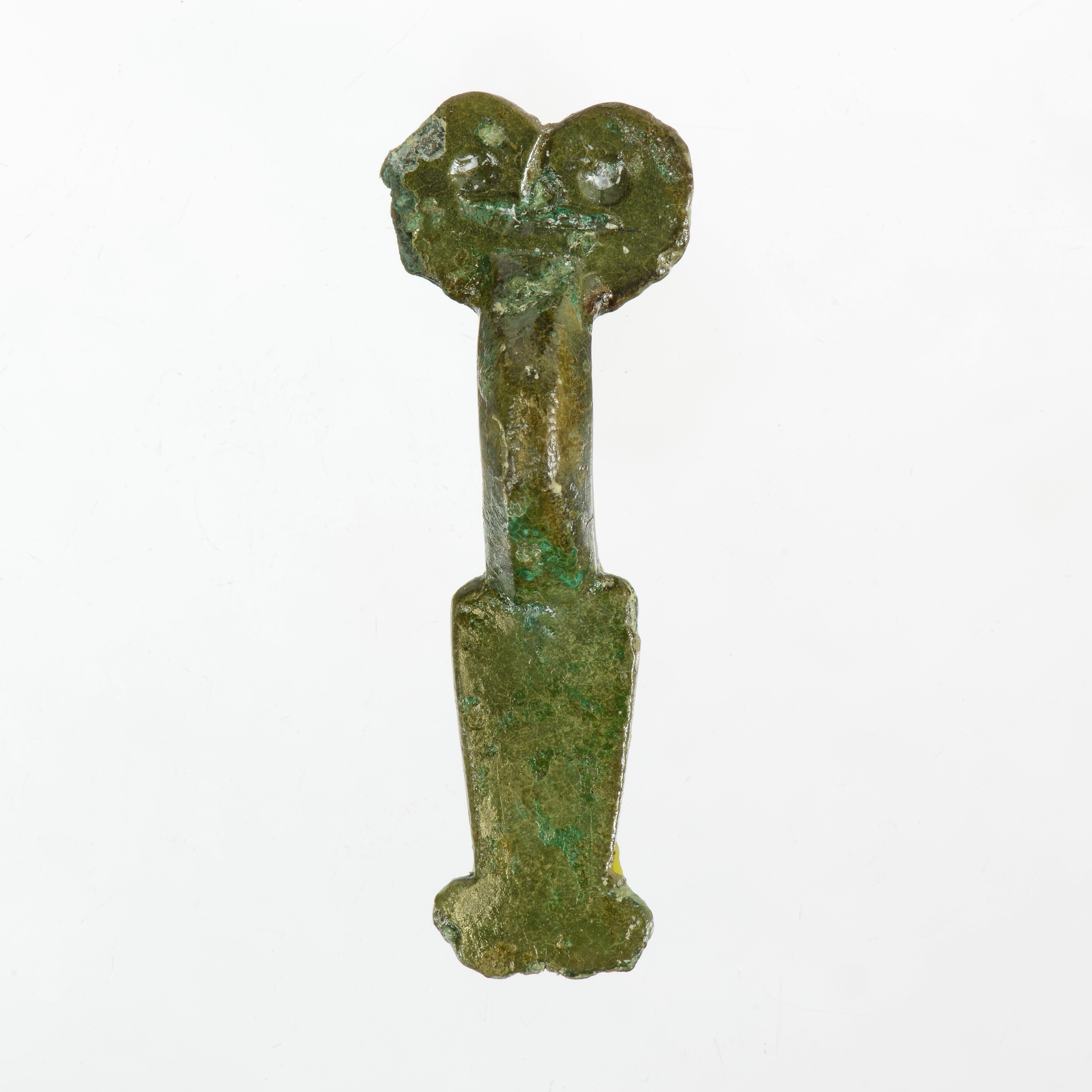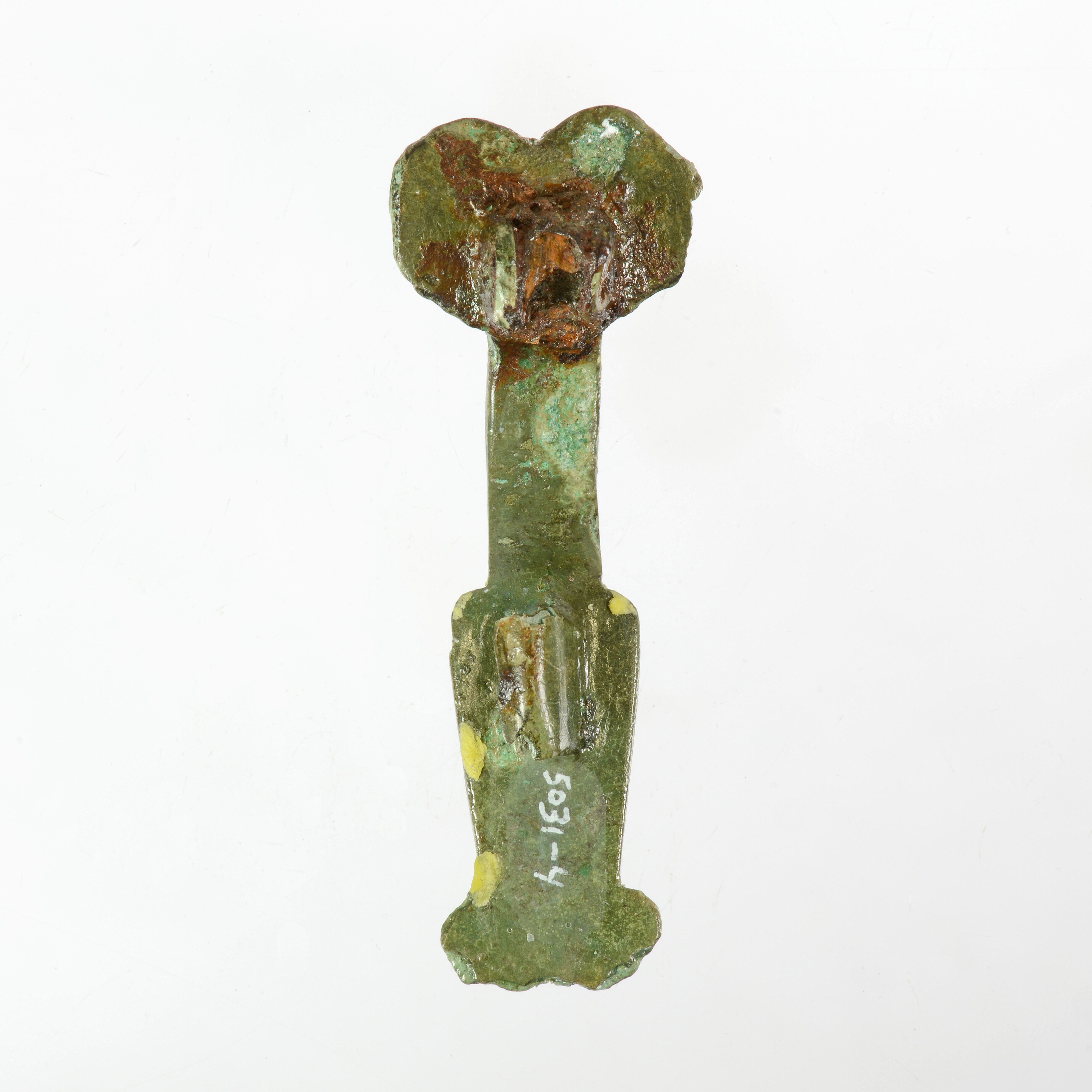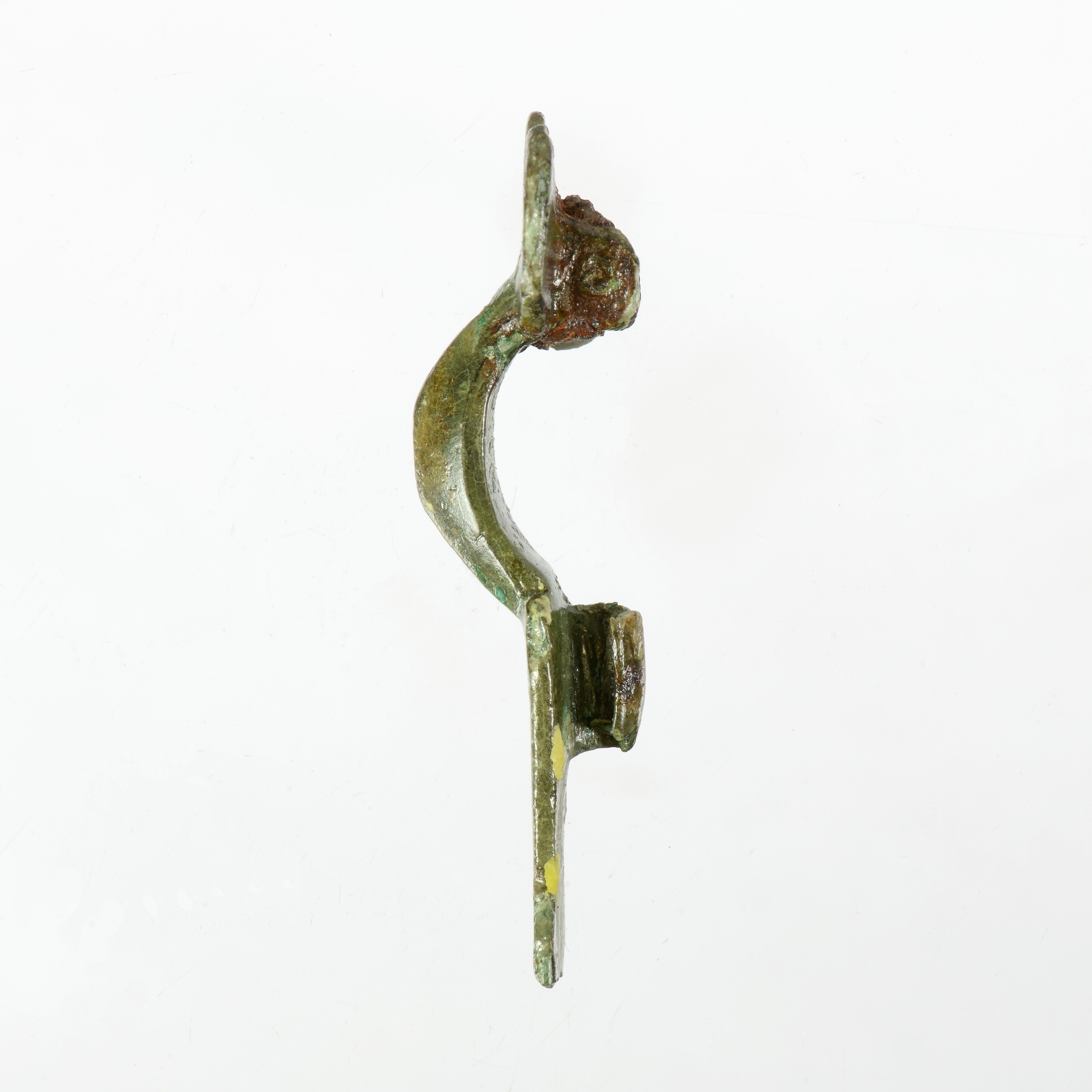 Beugelfibula; type Domburg; hartvormige kopplaat. De vorm van de kopplaat en de voet is beinvloed door de versiering op oudere exemplaren van dit type. Deze bestaat uit ineengerolde vogelkoppen