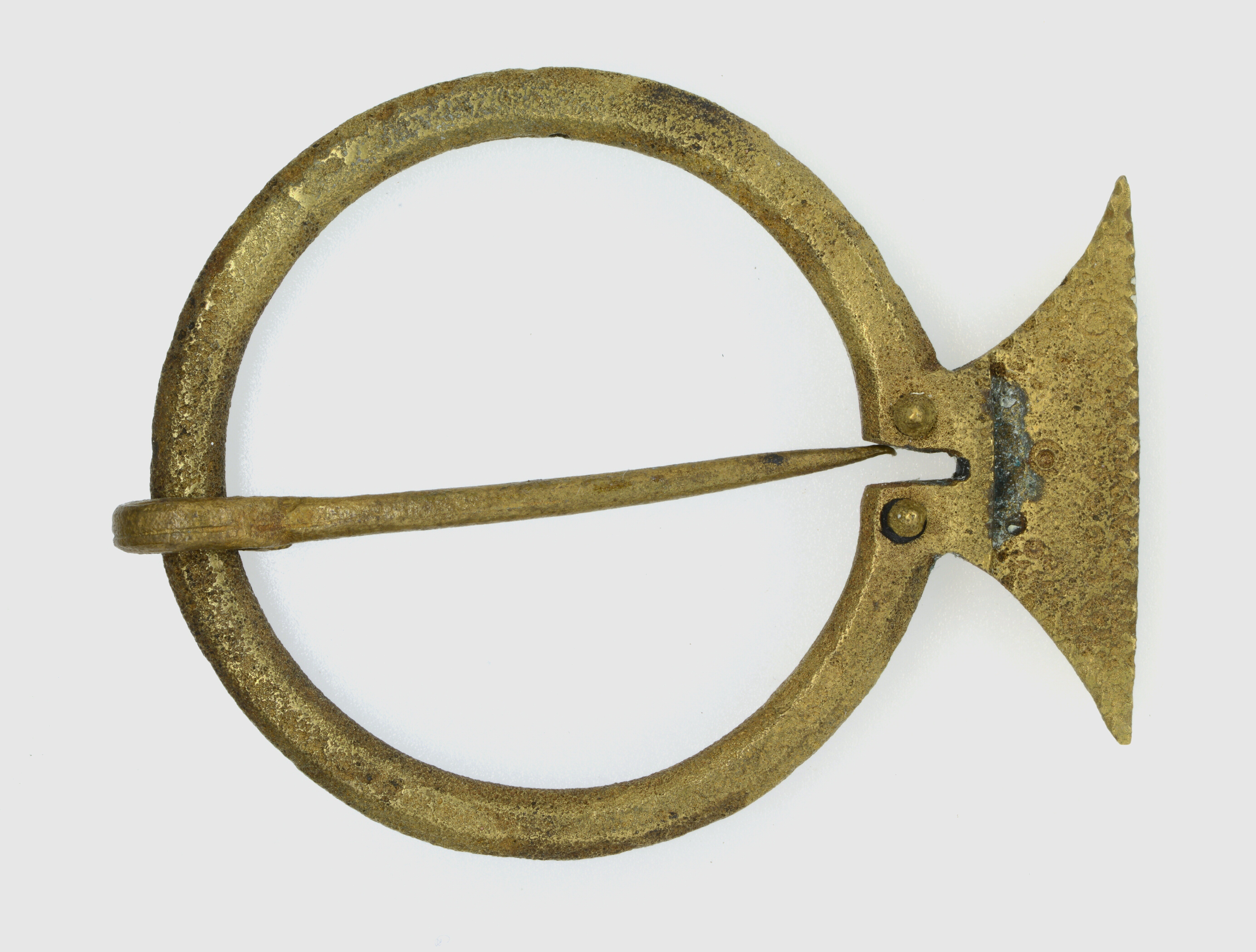 Omegafibula / ringfibula; achthoekig gefacetteerde ring en een trapeziumvormige plaat met een scherp zeshoekig profiel