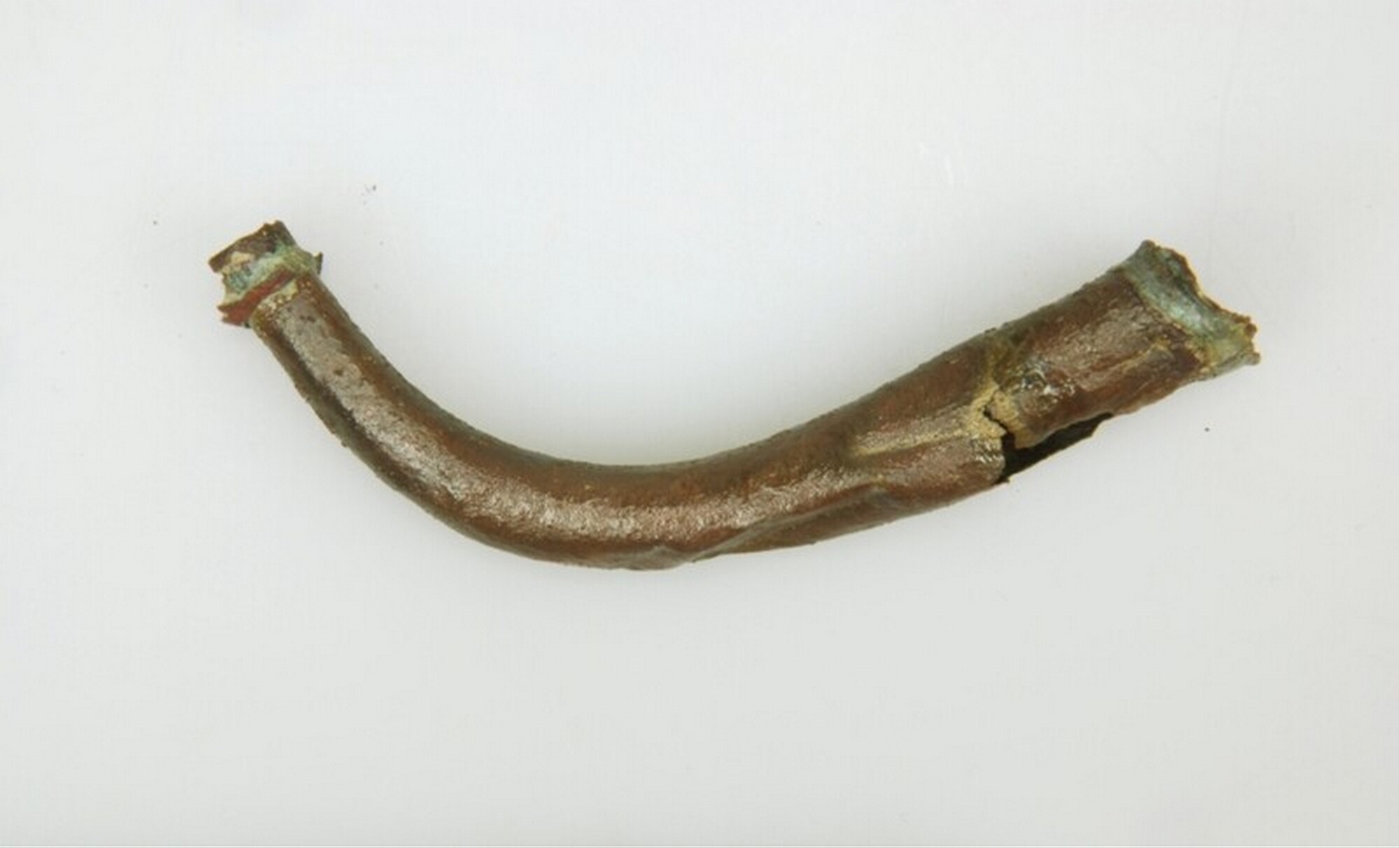 Drinkhoorn/kruithoorn; punt of tuit van dun gesoldeerd bronsblik. Opstaande rand aan het uiteinde