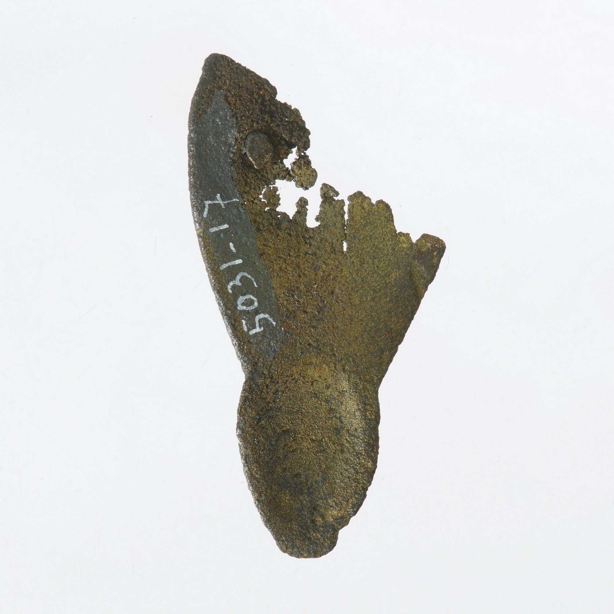 Beugelfibula; fragment voetplaat vormgegeven als gestileerde dierenkop; nagel ter hoogte van de vleugelpunt