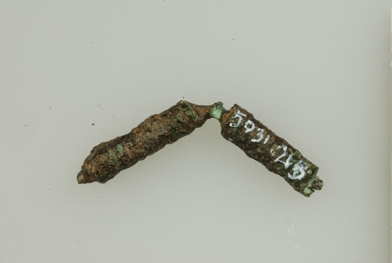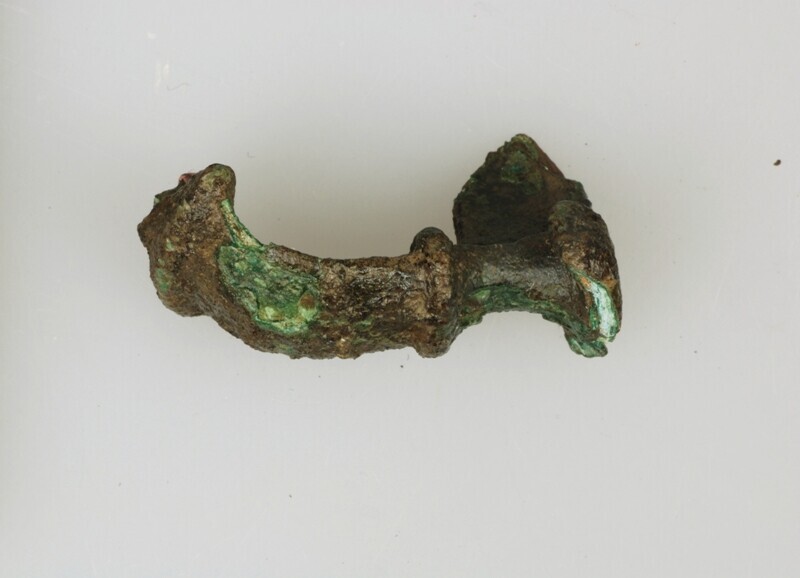 Trompetfibula?; type Almgren groep IV; meerdelige fibula met spiraal (ontbreekt) onder een trompetvormige plastische kop, die na een versmalling weer verbreedt naar een plastische beugelknop, waaraan een dunnere voet is bevestigd