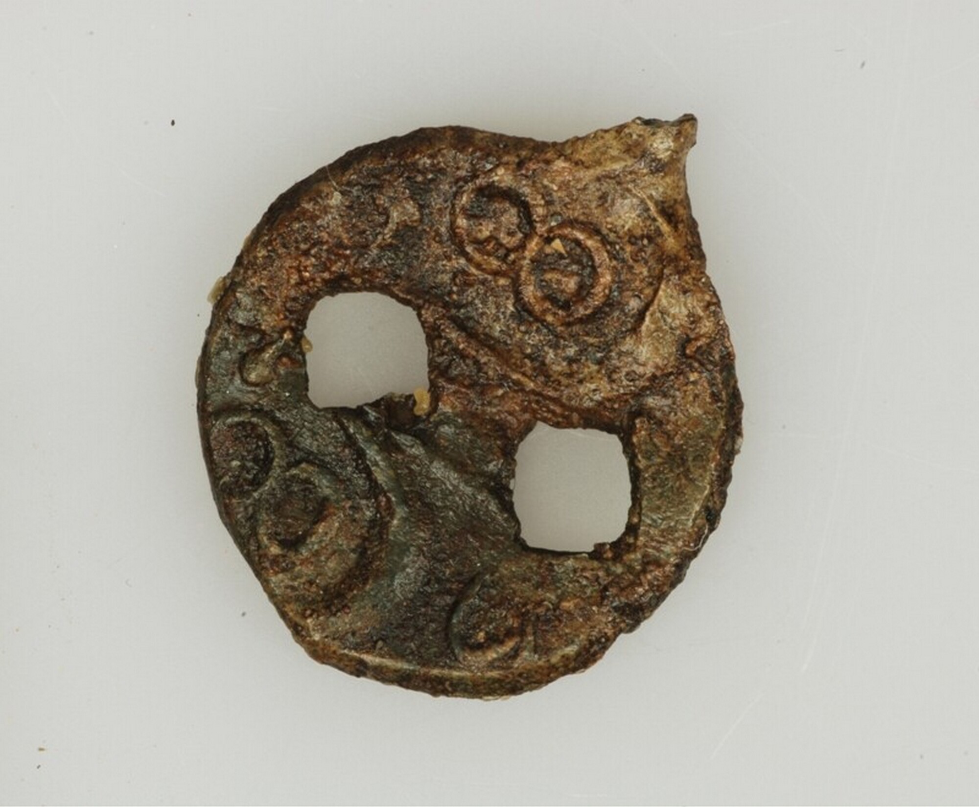 Textiellood; pb-tex-; versierd; twee gaten; vondstomstandigheden: afgegraven organische laag (ten Noorden van spoor 144); datum: 3-4-1996
