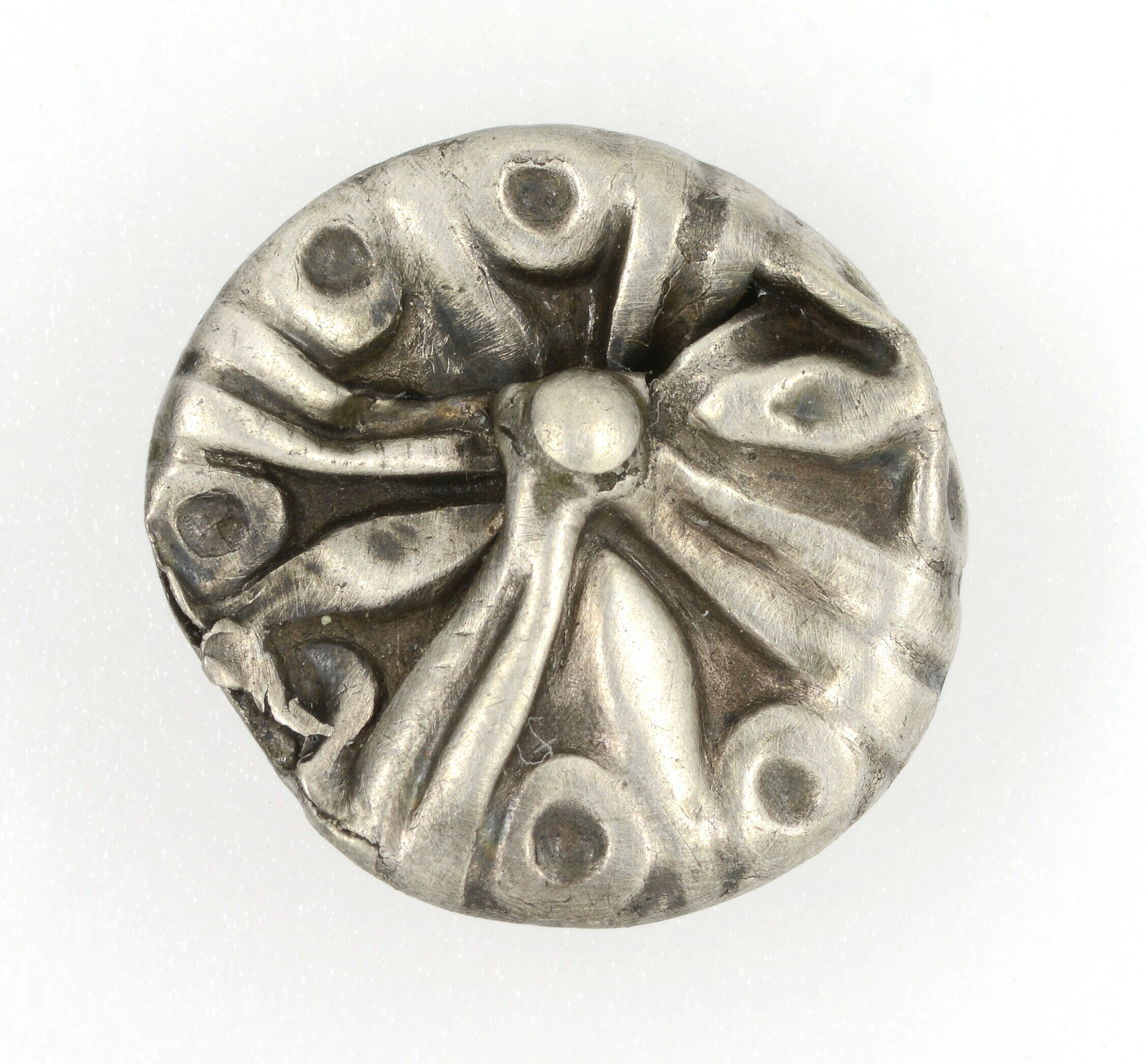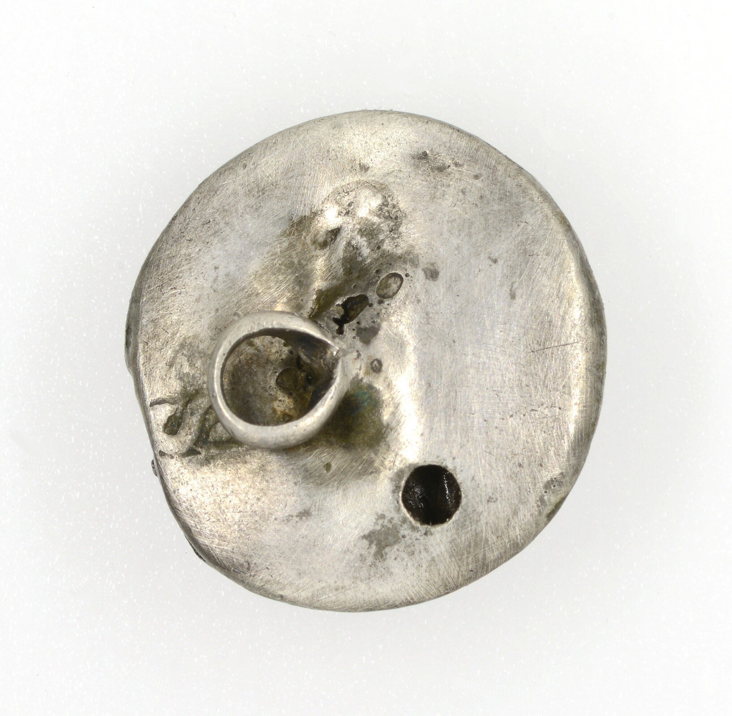 Knoop; halfbolvormige holle knoop met een knopje bovenop; draadoog; reliëfversiering: gelijkarmig kruis en tussen de armen Franse lelies; onderzijde: klein gat en merkteken met jaarletter S