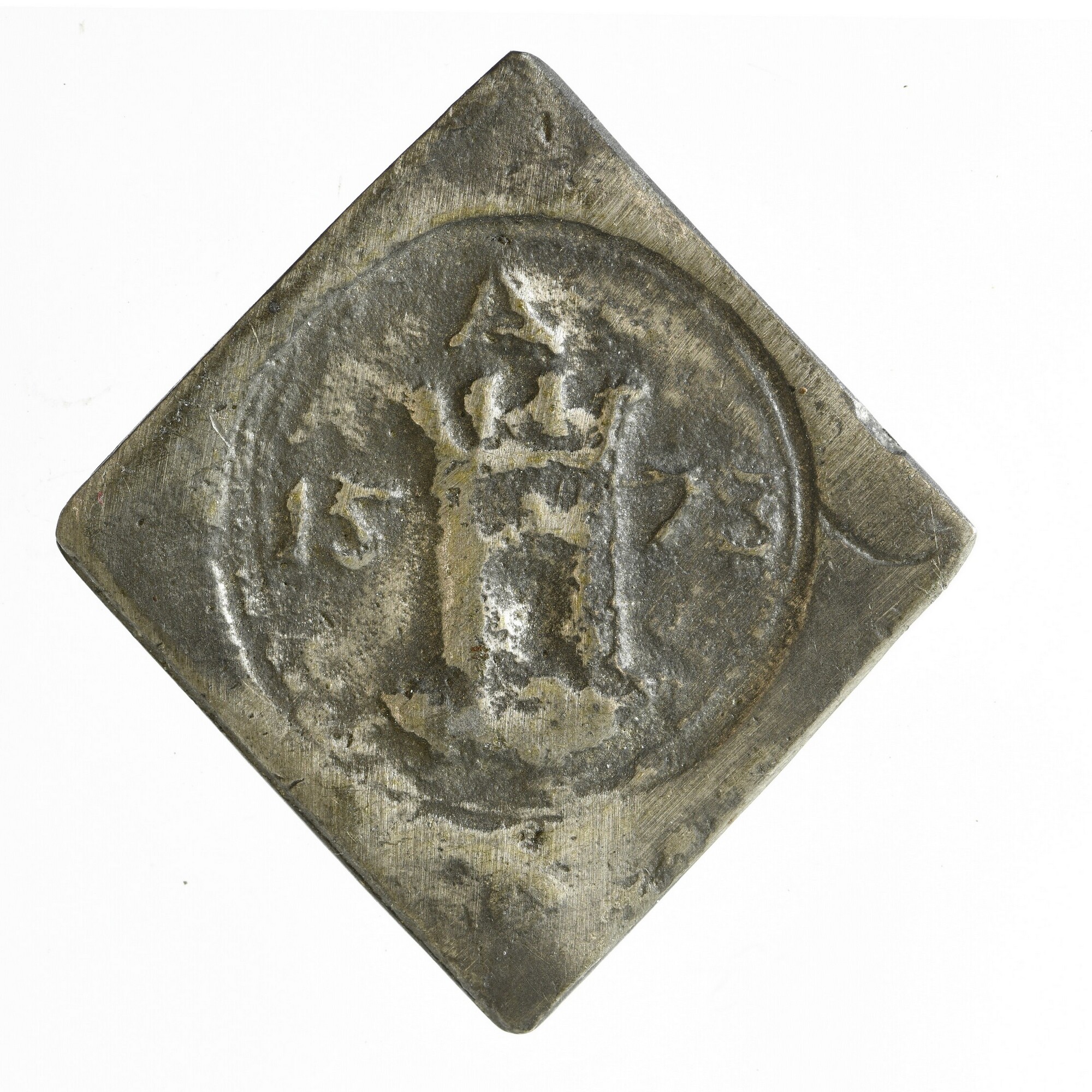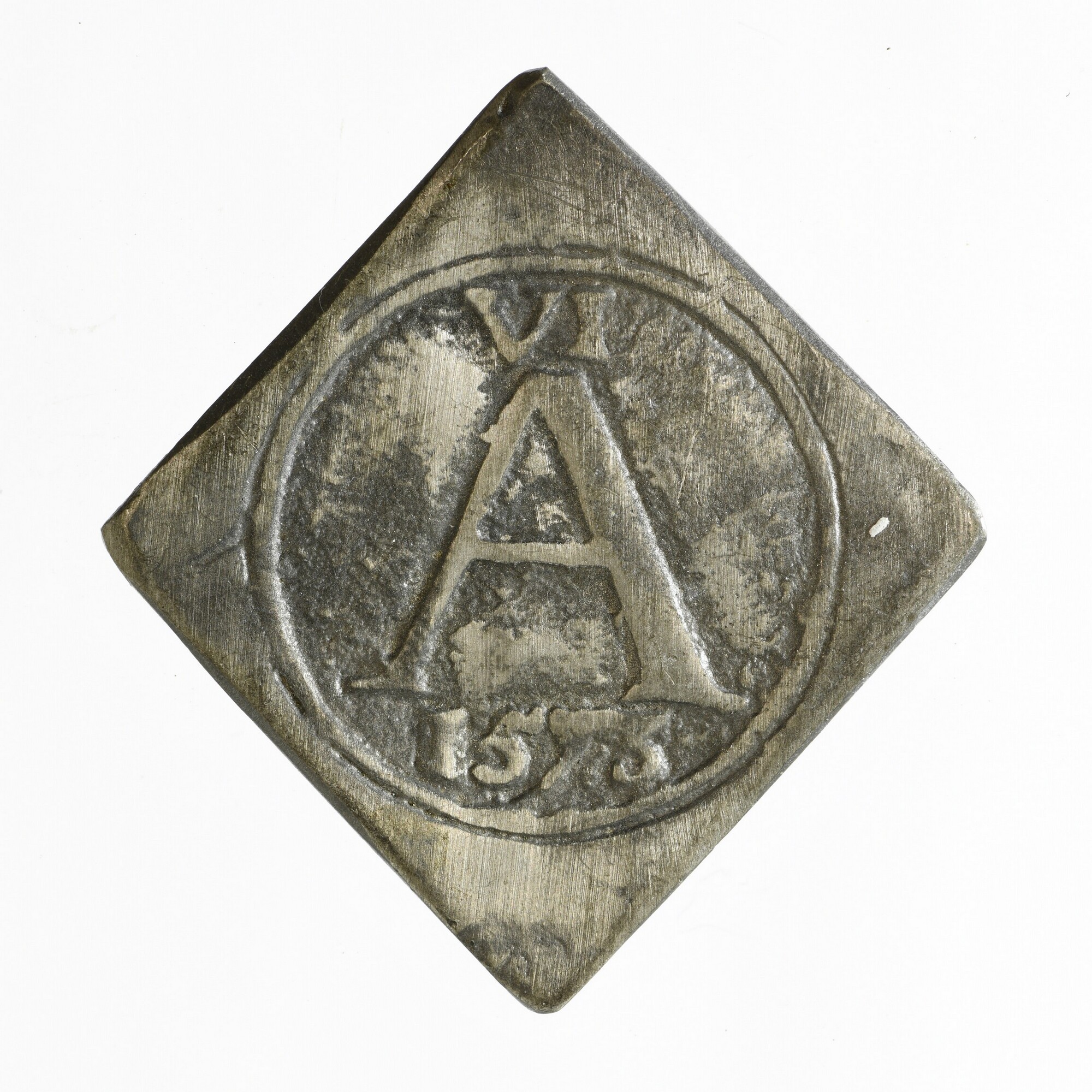 Noodmunt; Alkmaar; ruitvormig; vz.: binnen een cirkel in drie regels VI / A / 1573; kz.: binnen een cirkel een centrale stadspoort met aan weerszijden 15 - 73; gewicht: 7.72 gram