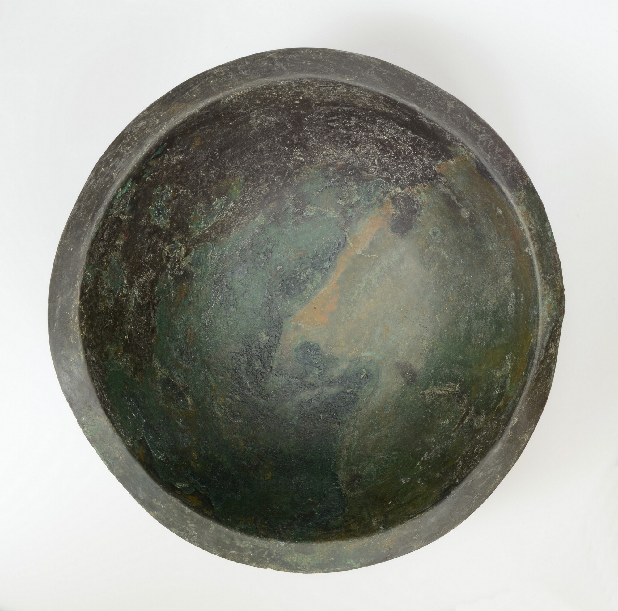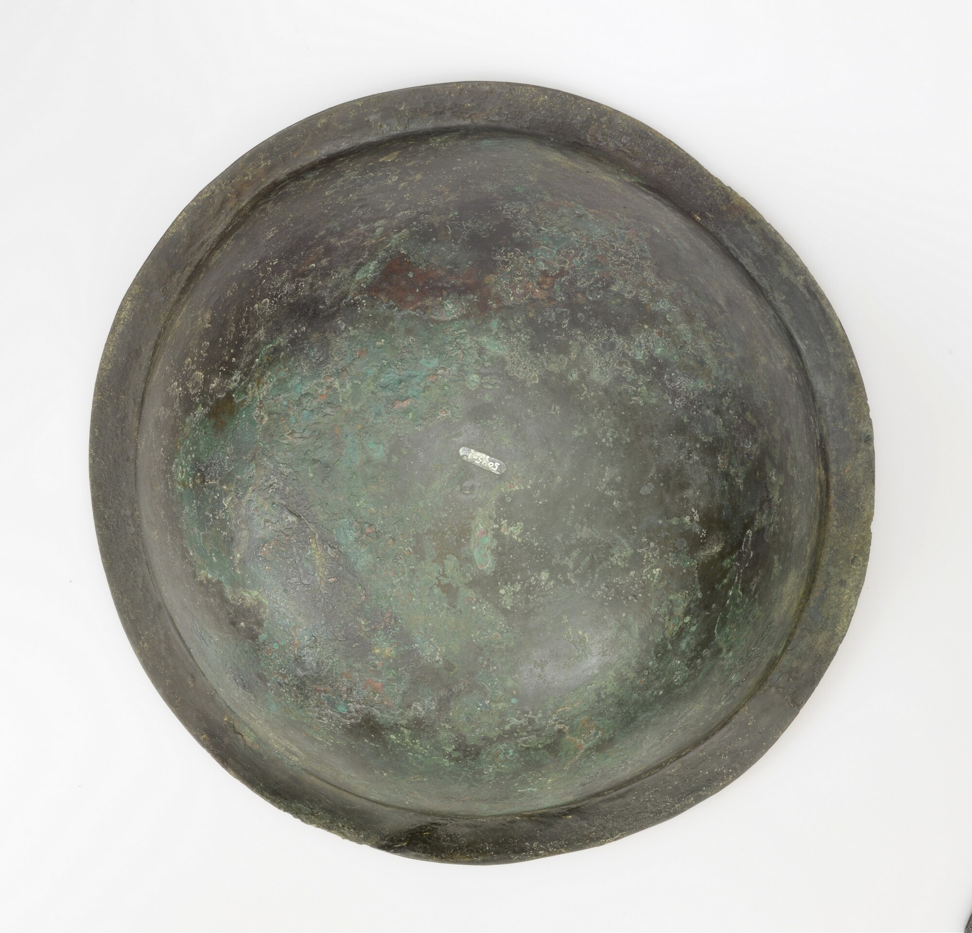 Schaal; groot, bol formaat met brede kraagrand, lensvormige bodem; de rand is licht verbogen