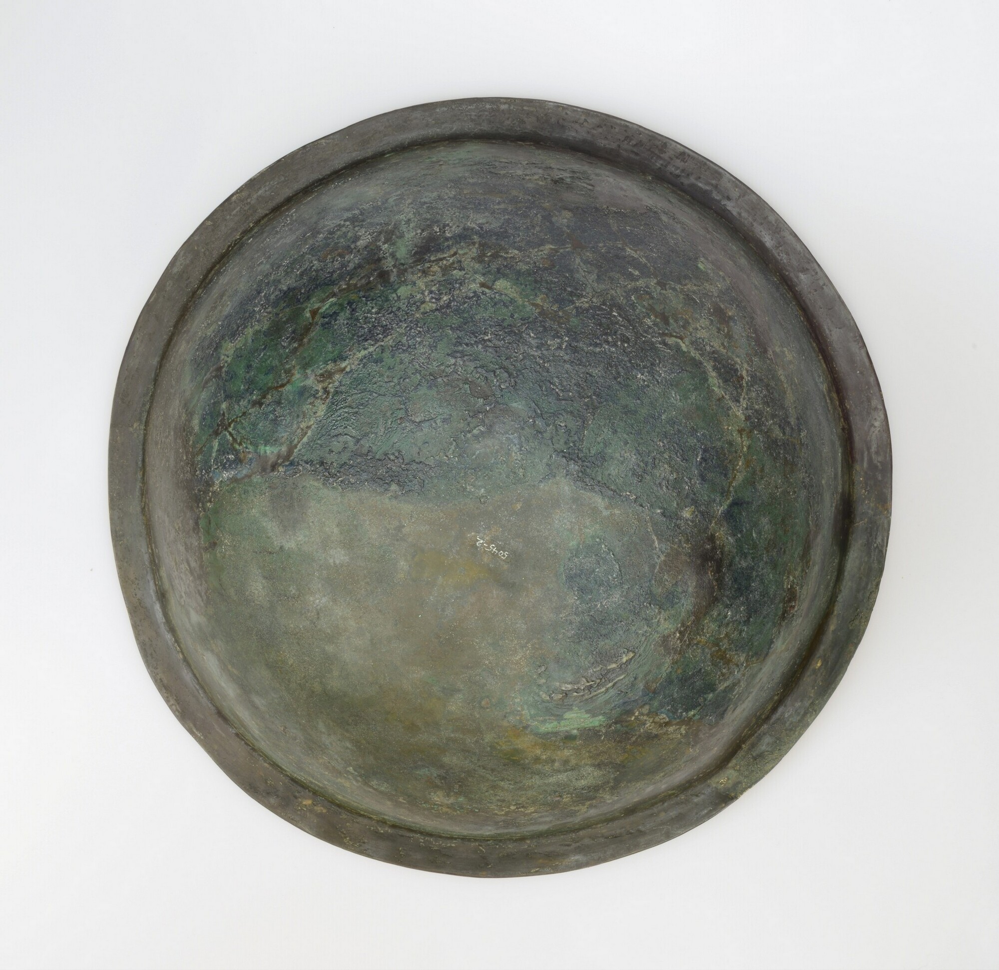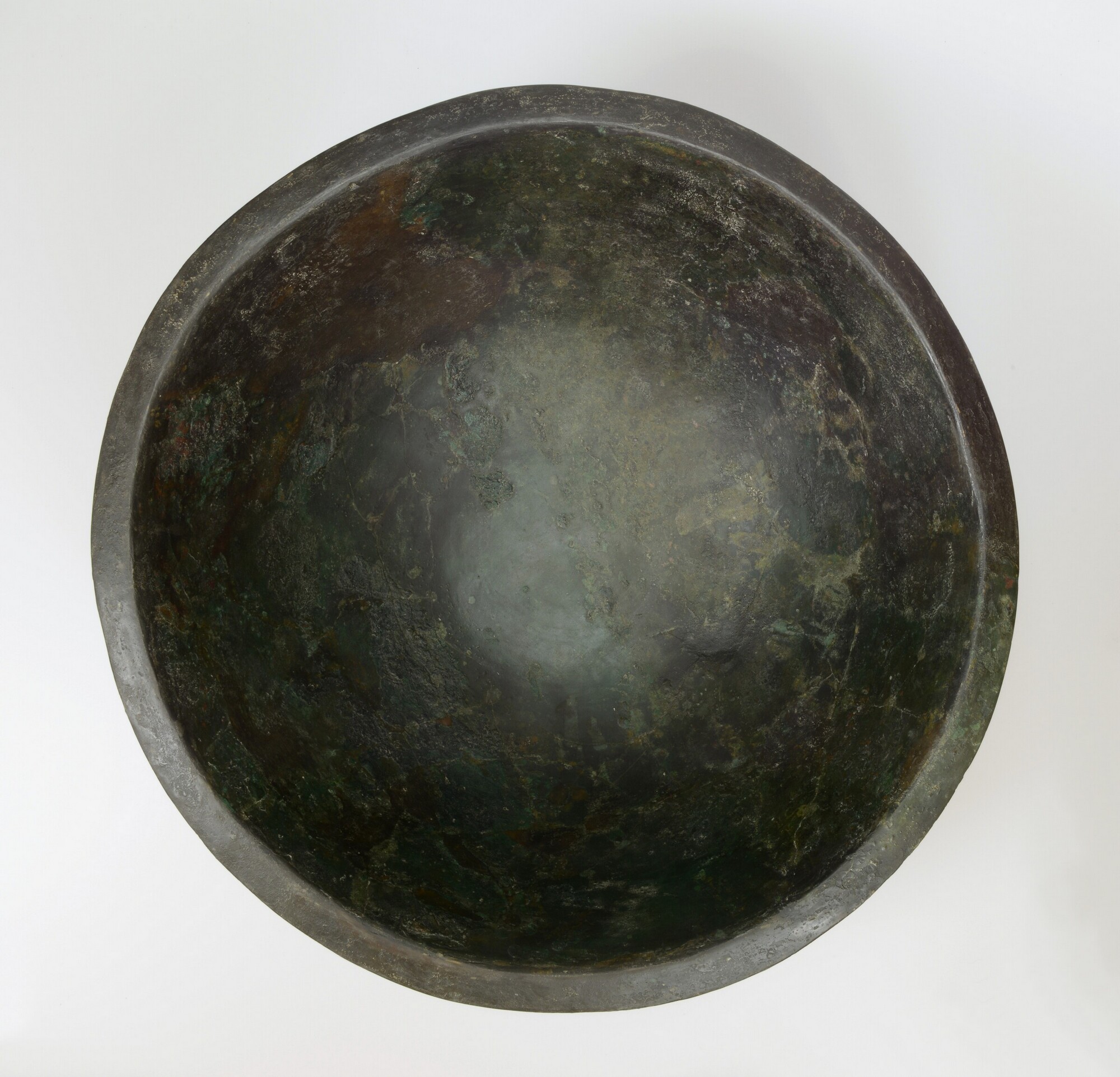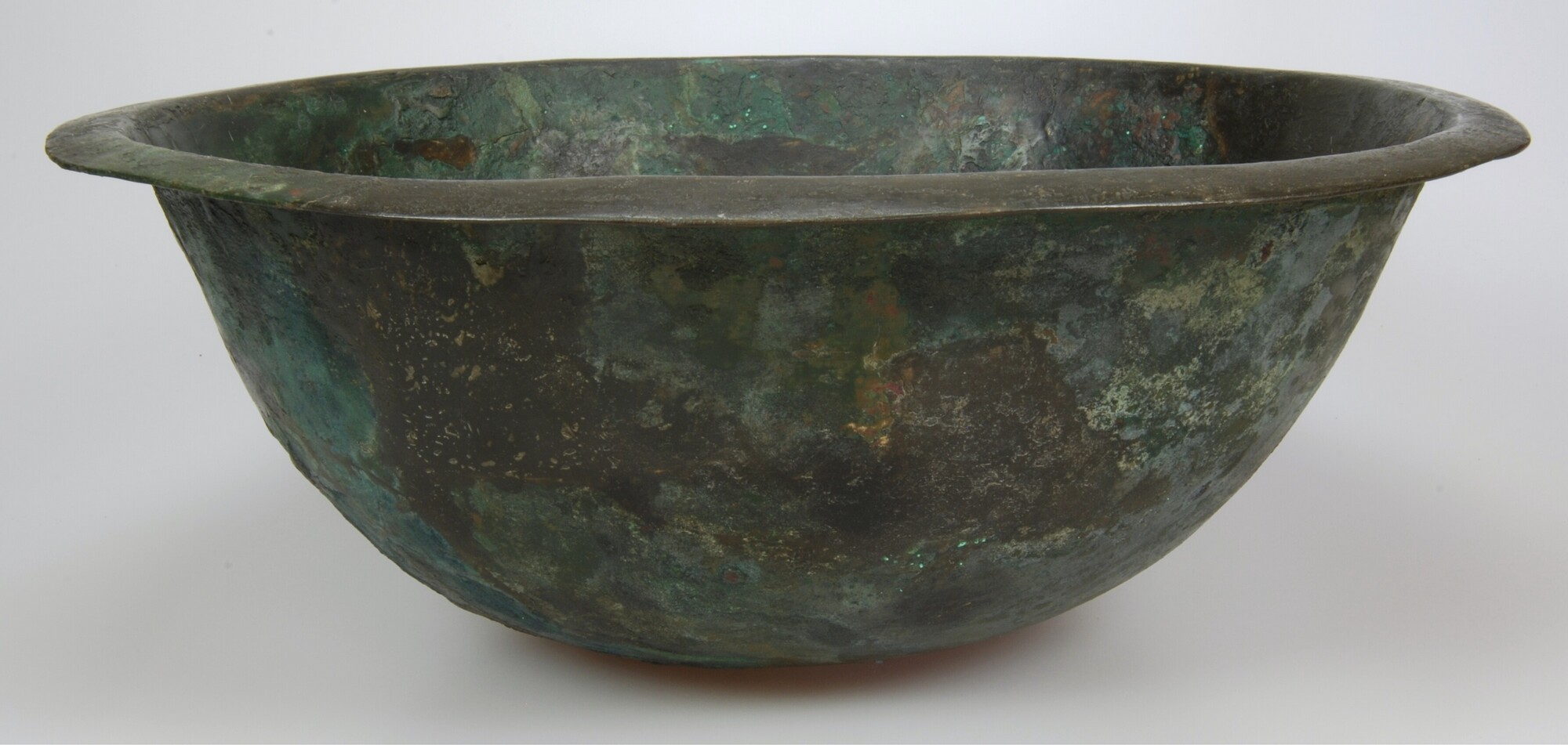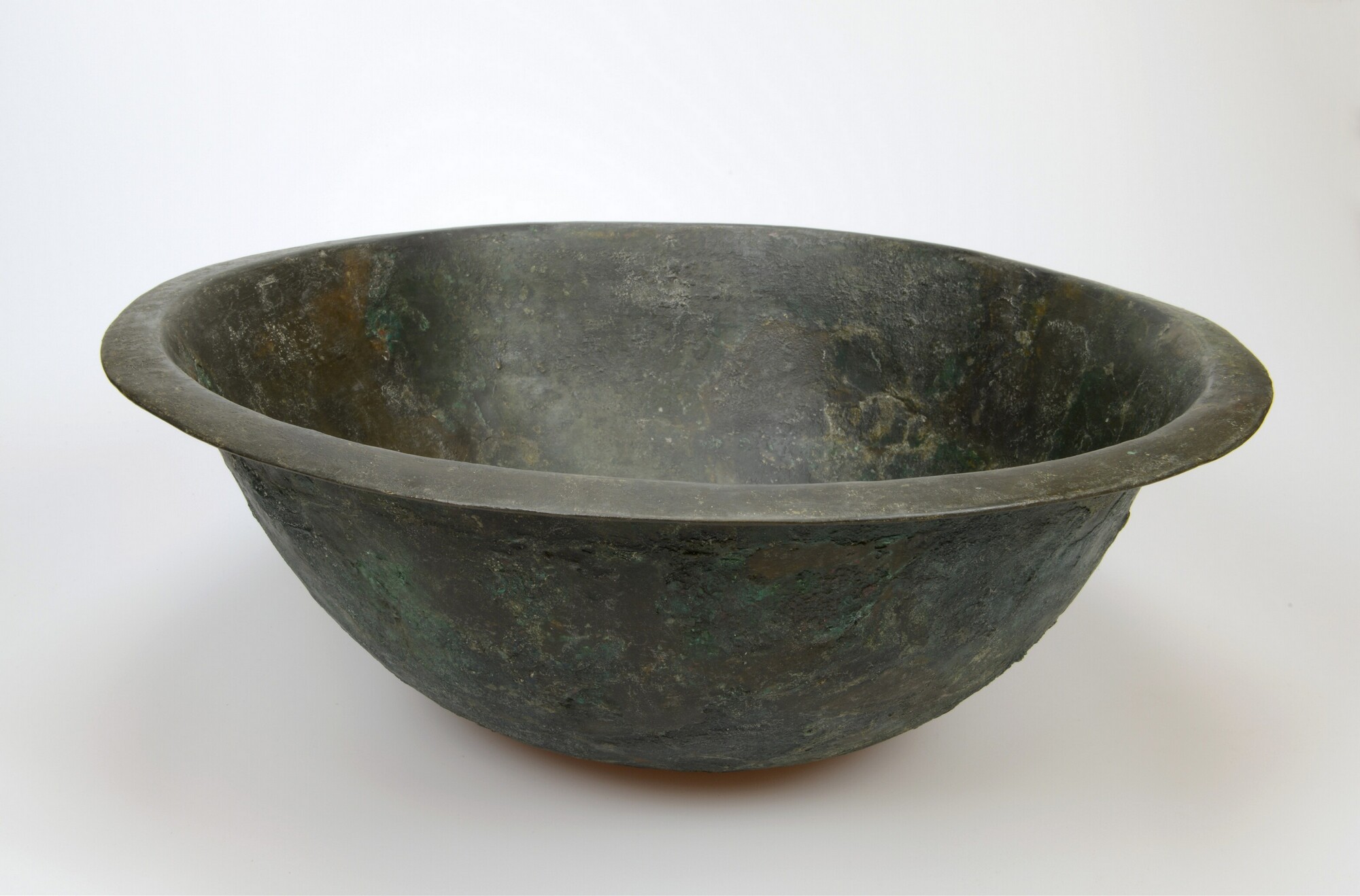 Schaal; groot, bol formaat met brede kraagrand, lensvormige bodem