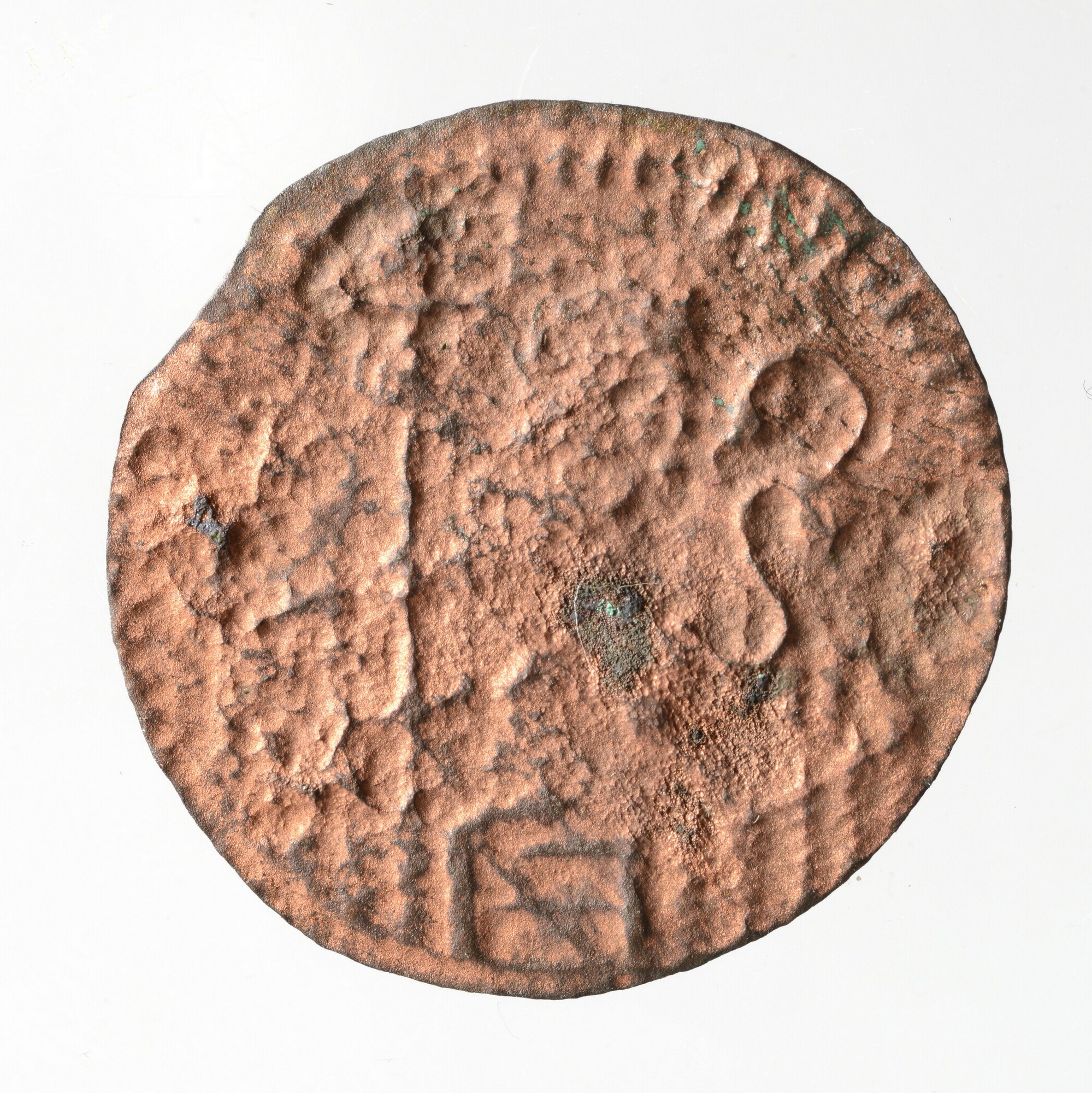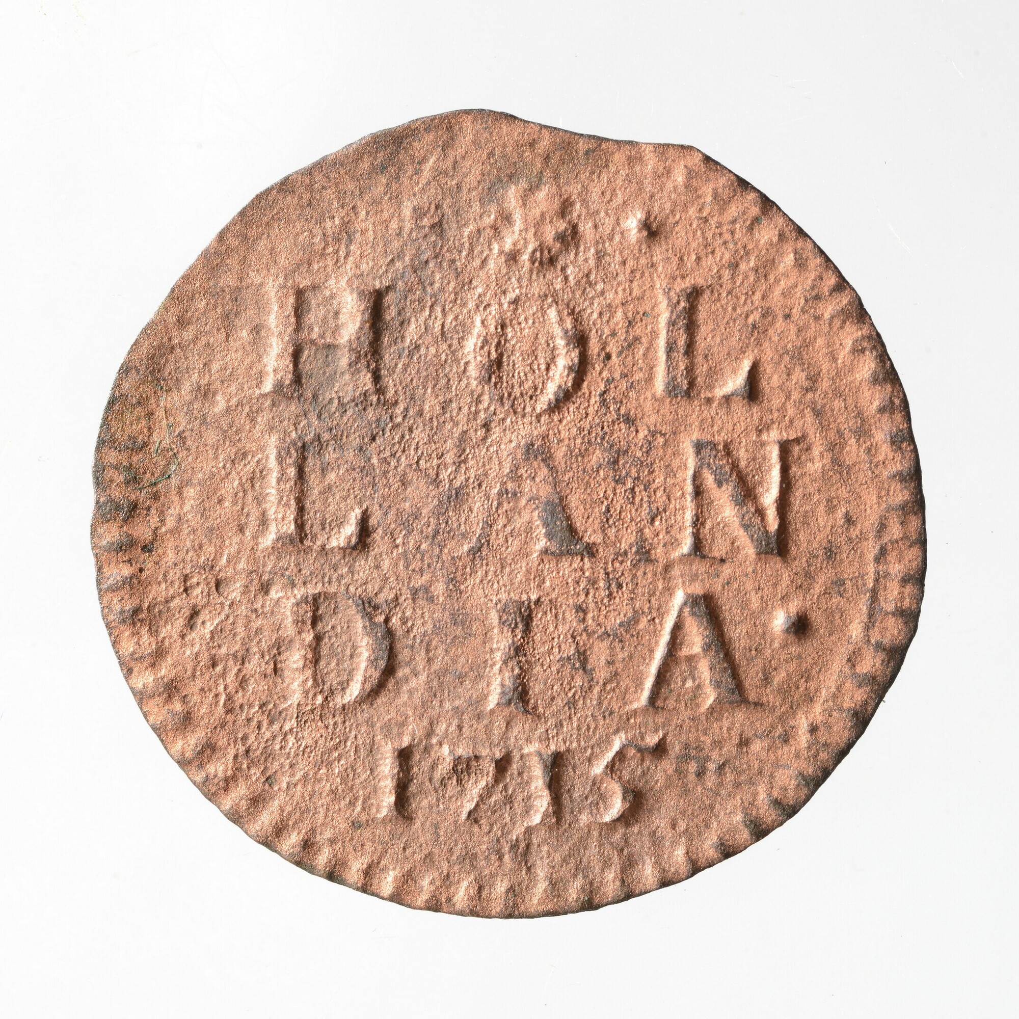 Duit; Holland Provincie (1581-1795); vz.: in vijf regels: •(rozet)• / HOL / LAN / DIA• / 1715; kz.: klimmende leeuw naar links met vrijheidshoed en een lans binnen de Hollandse tuin; muntplaats: Dordrecht; gewicht: 1.76 gram