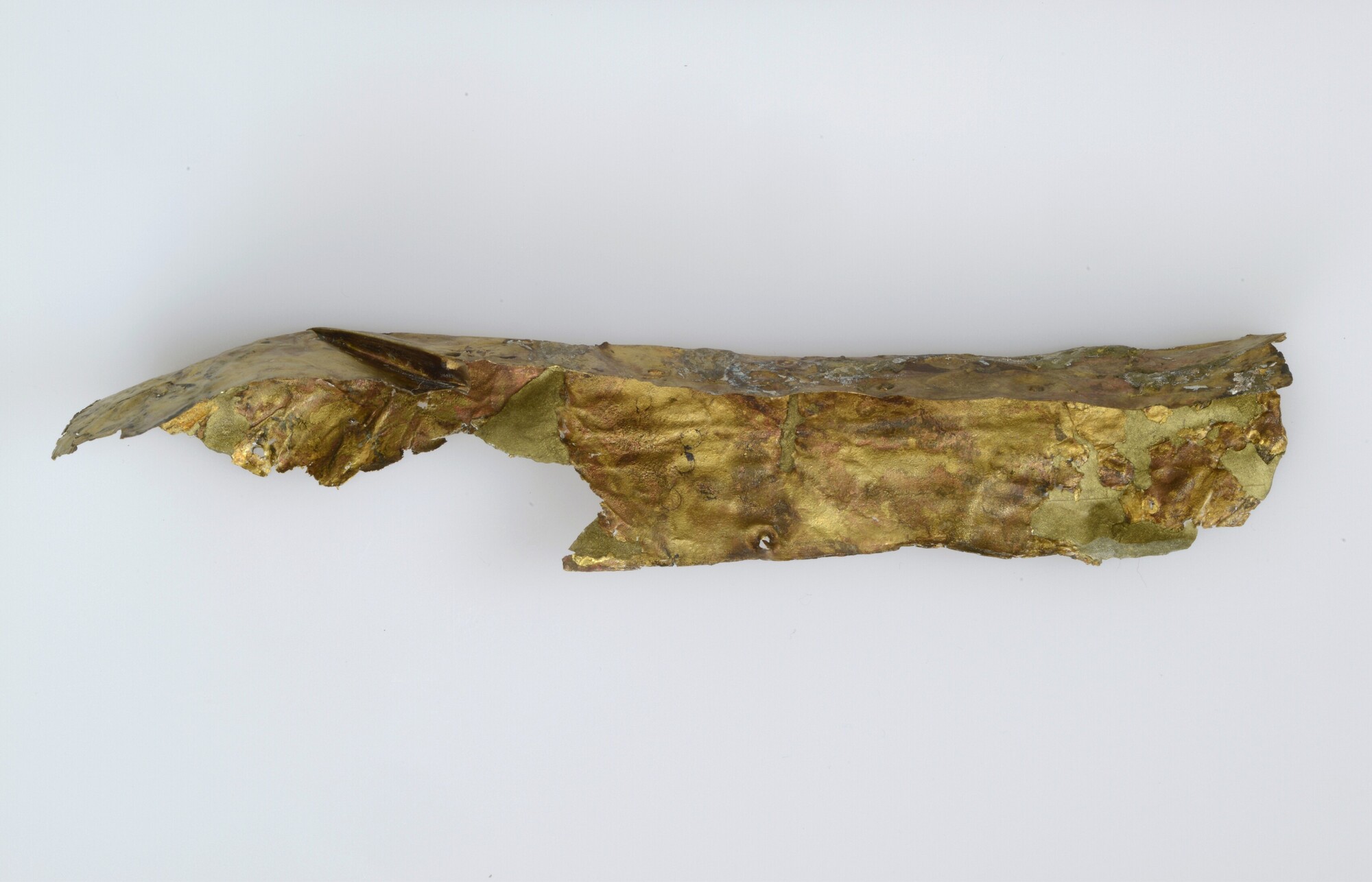 Schildrandbeslag; fragment; in de randen bevinden zich meerdere spijkergaten