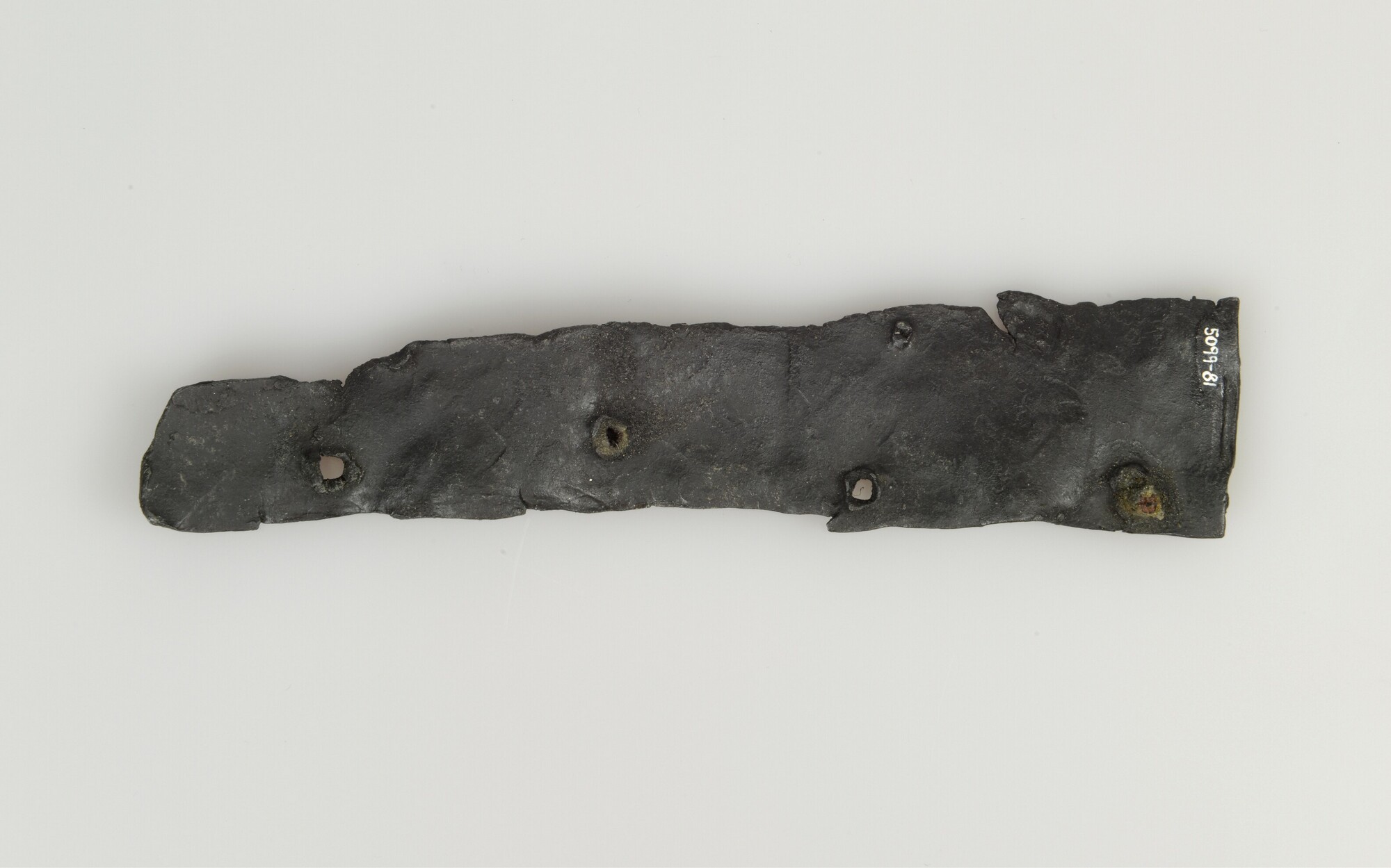 Beslagplaat; rechthoekig, met vier vierkante gaten en onregelmatig gevormde rand