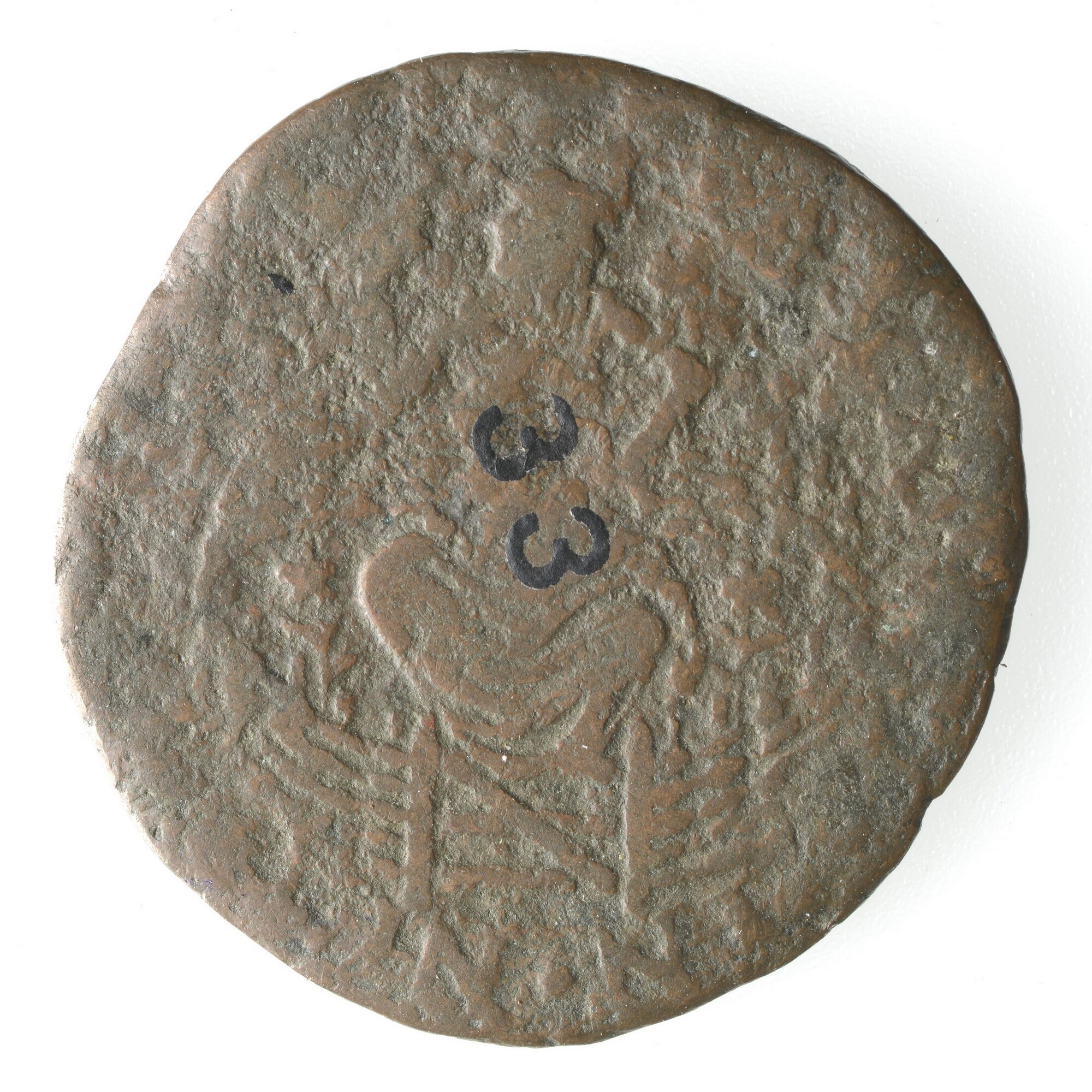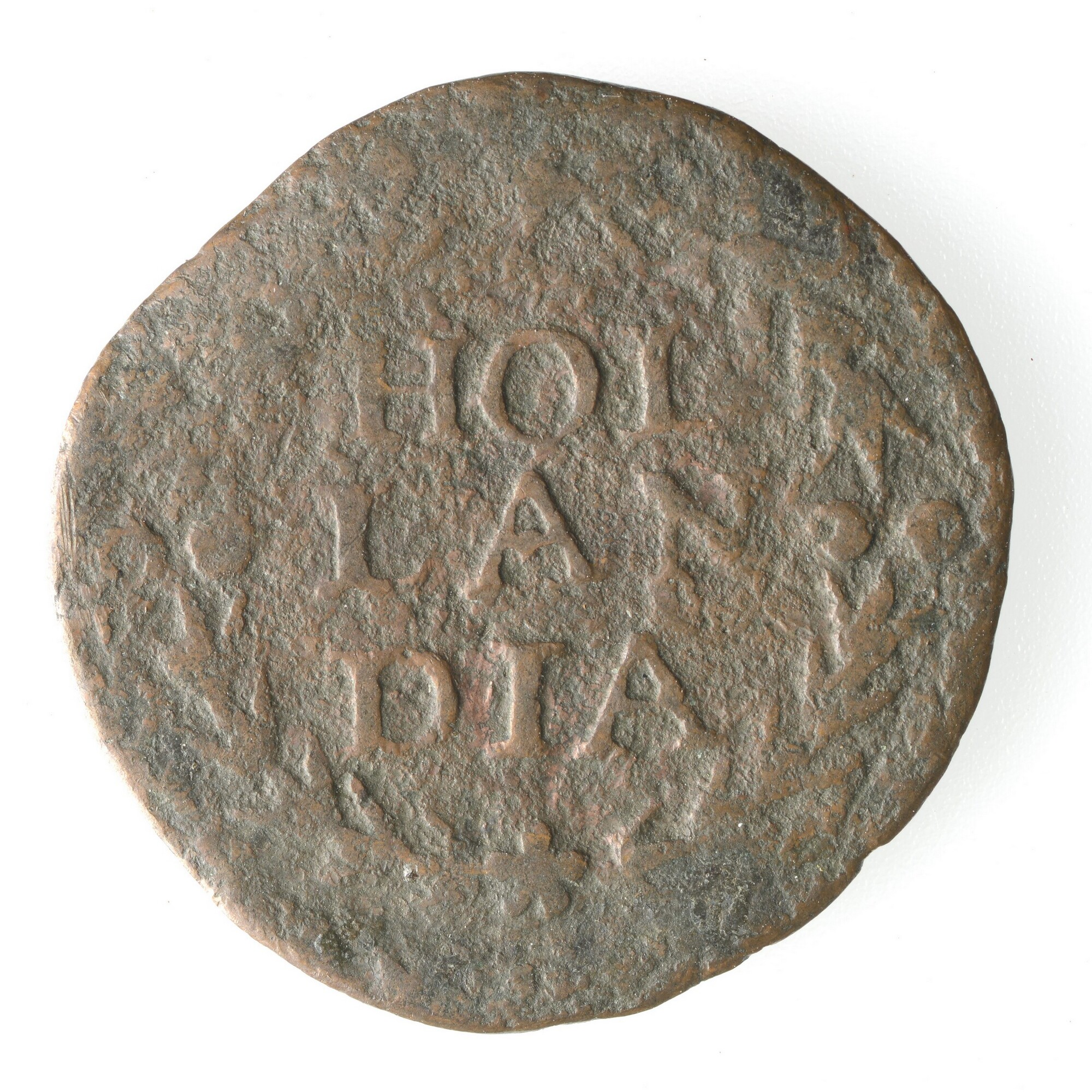 Duit Holland Provincie (1581-1795); vz.: binnen een bladerkans in drie regels: HOL / LAN / DIA; kz: maagd gezeten binnen en niet gesloten omheining, met de rechterarm omhoog, wijzend naar de zon, met omschrift [•AV]X•N[OS•IN•]NOM•]DO[M•(rozet)]; muntplaats: Dordrecht; gewicht: 2.85 gram