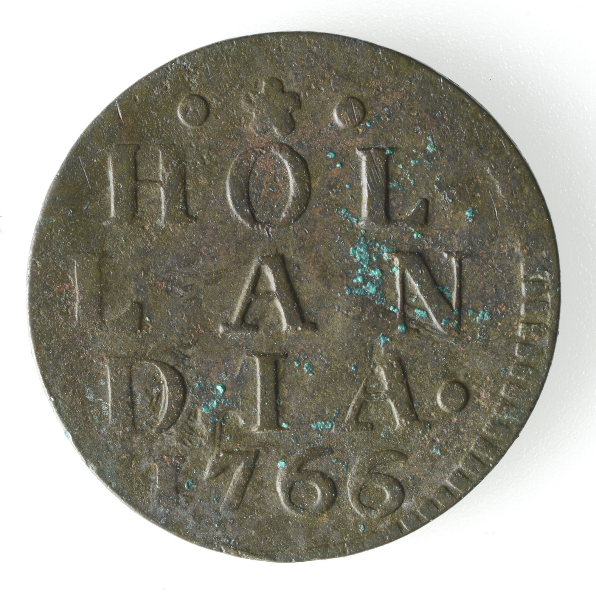 Duit Holland; vz: HOL LAN DIA. in drie regels en het jaartal 1766; kz: een leeuw naar links in een gesloten Hollandse tuin. De leeuw heeft met zijn klauwen een speer vast met op de punt de zogenaamde vrijheidshoed; gewicht: 3.20 gram