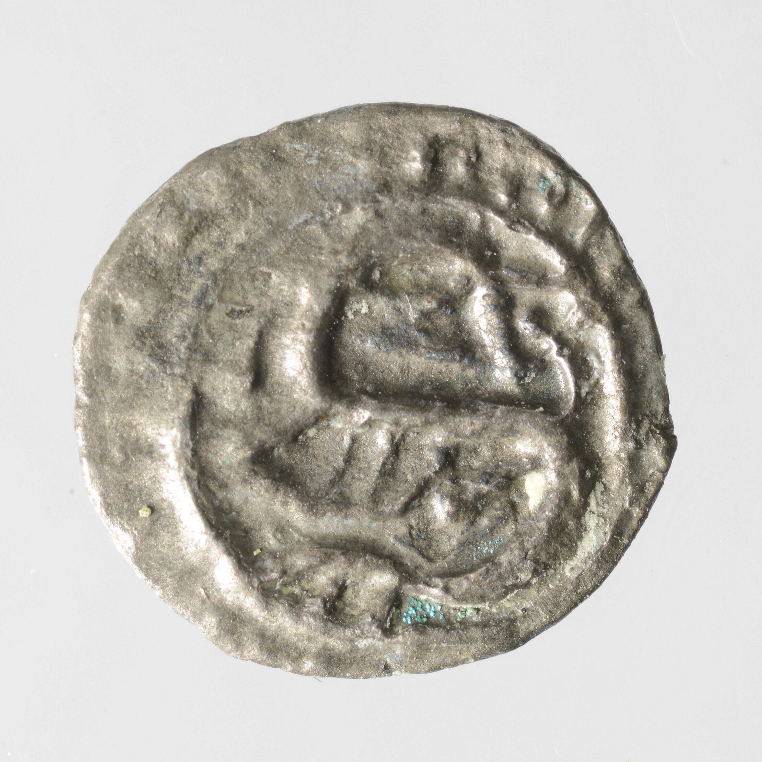 Sceatta; type BMC 31 (Wodan/monster); vz.: binnen parelrand, gestileerd aanziend gezicht, met stijl uitstralend haar en dito snor en baard, aangegeven door drie gebogen lijnen. Ter weerszijden van het hoofd bolkruisjes en midden boven het hoofd een kogeltje; kz.: binnen parelrand, gestileerd dier naar links, met kop naar rechts bijtend naar driedelige staart; muntplaats: onbekend, ...