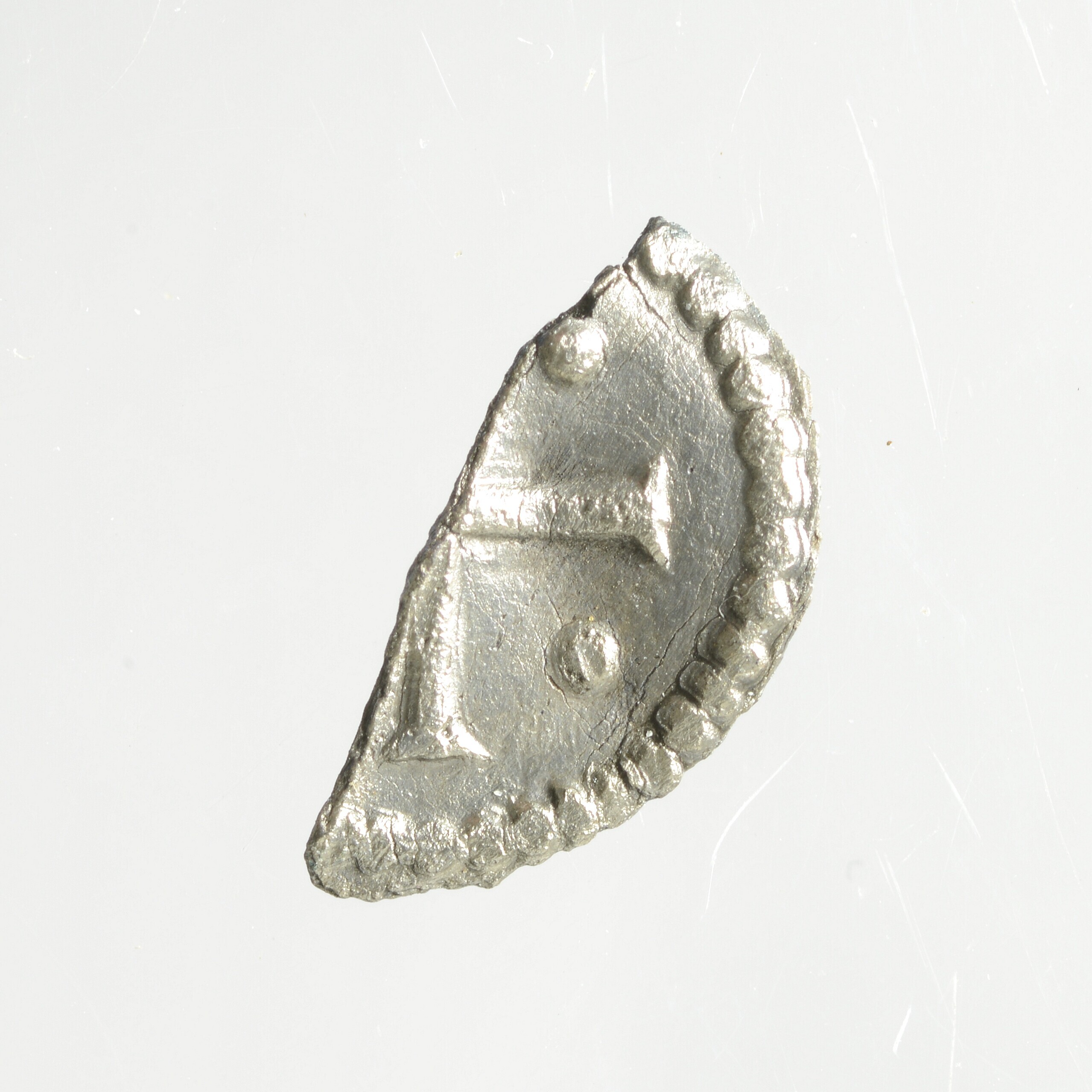 Denarius; fragment, ca 1/2; vz.: binnen geparelde rand, een kruis met aan weerszijde twee bolletje; kz.: versleten; vondstdatum: 10-10; gewicht: 0.20 gram;