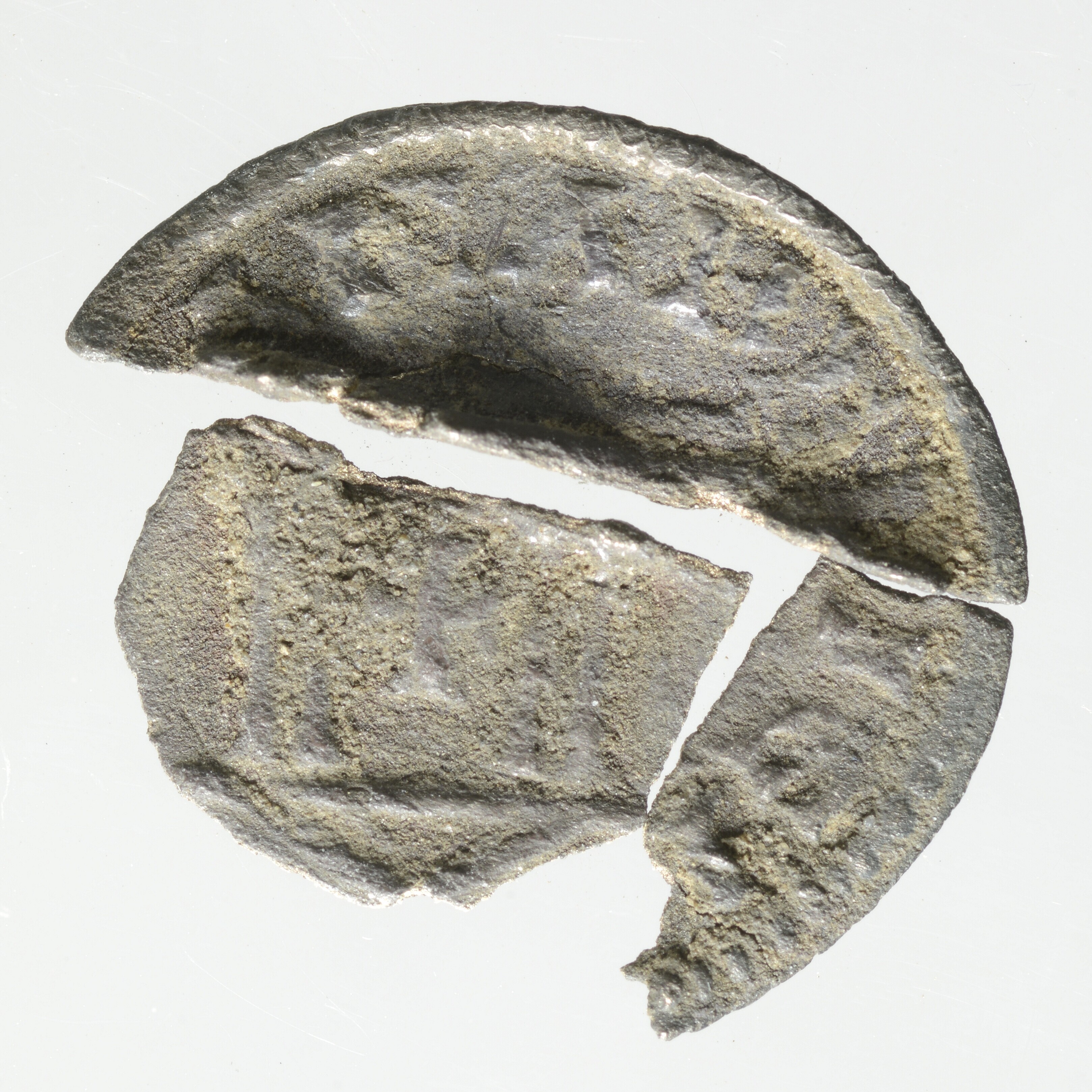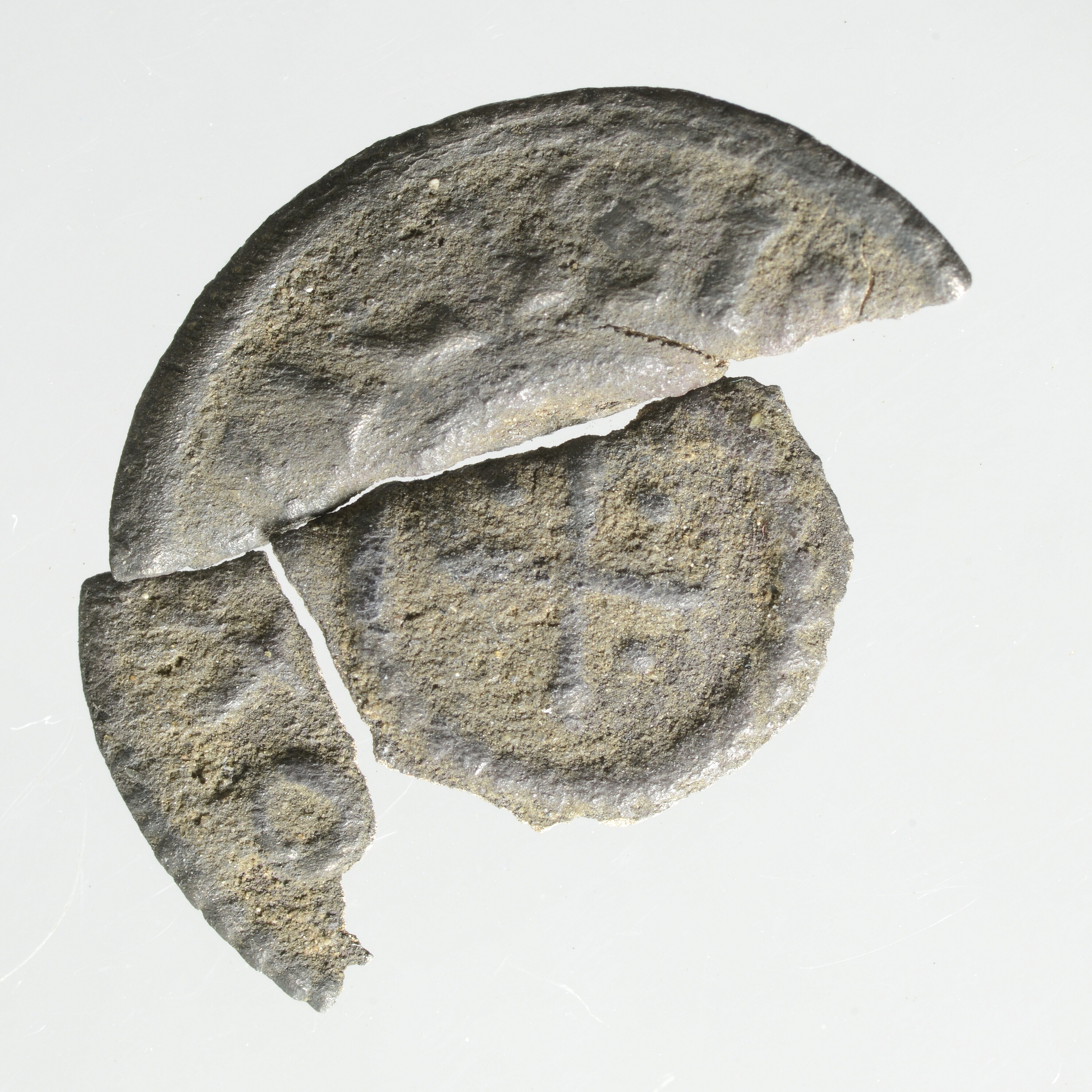 Denarius; Lodewijk de Vrome; bestaat uit drie bij elkaar behorende fragmenten; vz.: in het midden binnen de parelrand een Karolingisch kruis, aan de buitenzijde een parelrand en de randtekst +HLVD ICVS.IMP; kz.: tempel?; gewicht: 1.10 gram; vondstdatum: 29-4-1996; referentie: MG 472