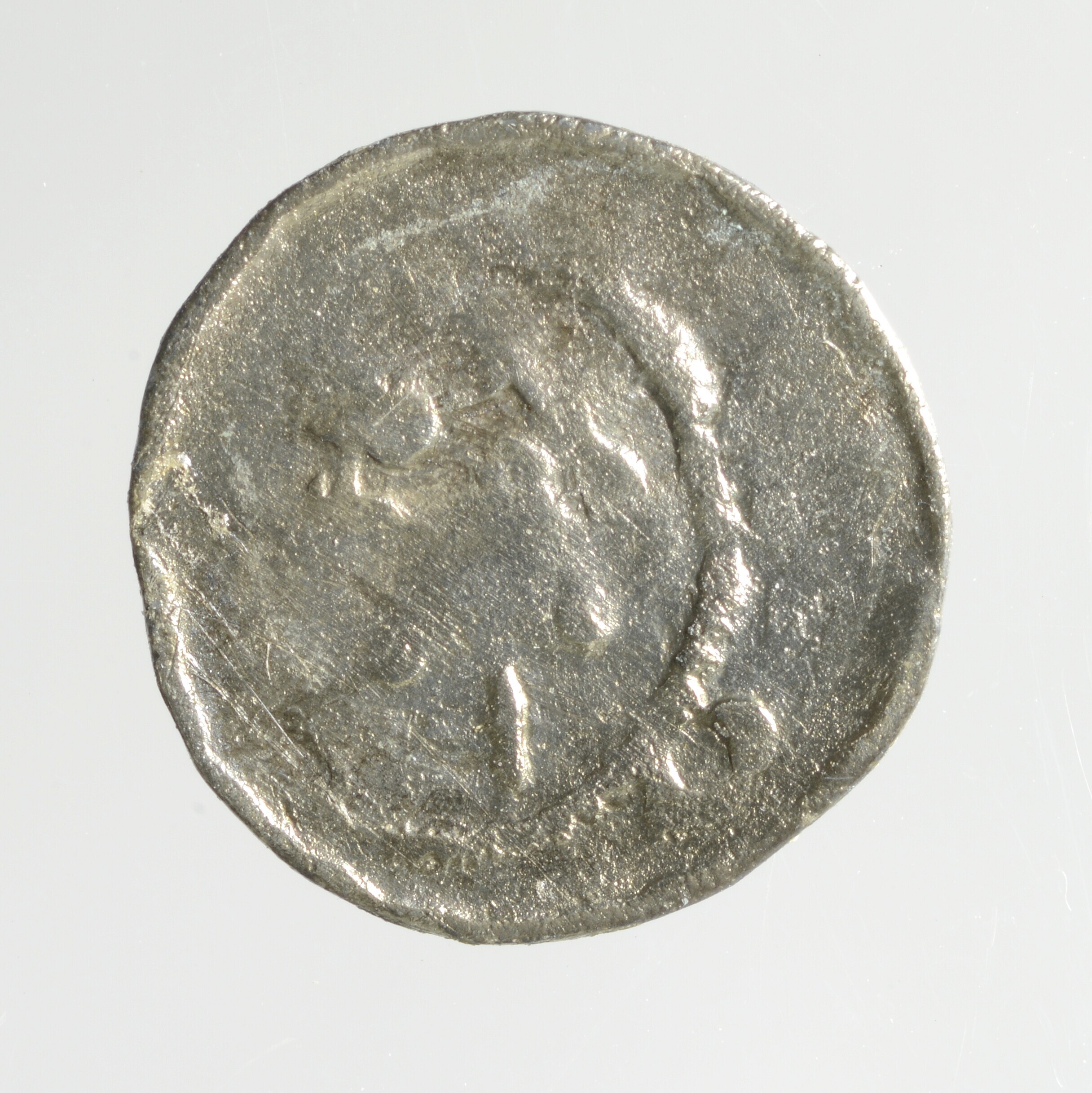 Penning; Floris V; vz.: Primitief hoofd met gravenmuts naar rechts; kz.: Lang kruis opgebouwd uit een dubbele lijn waarvan de armen eindigen als kogels (zbn. long cross). Aan de zijkant bevindt zich een zelfde kruis (misslag?); gewicht: 0.46 gram; vondstplaats: Dordrecht; vondstdatum: 21- ...