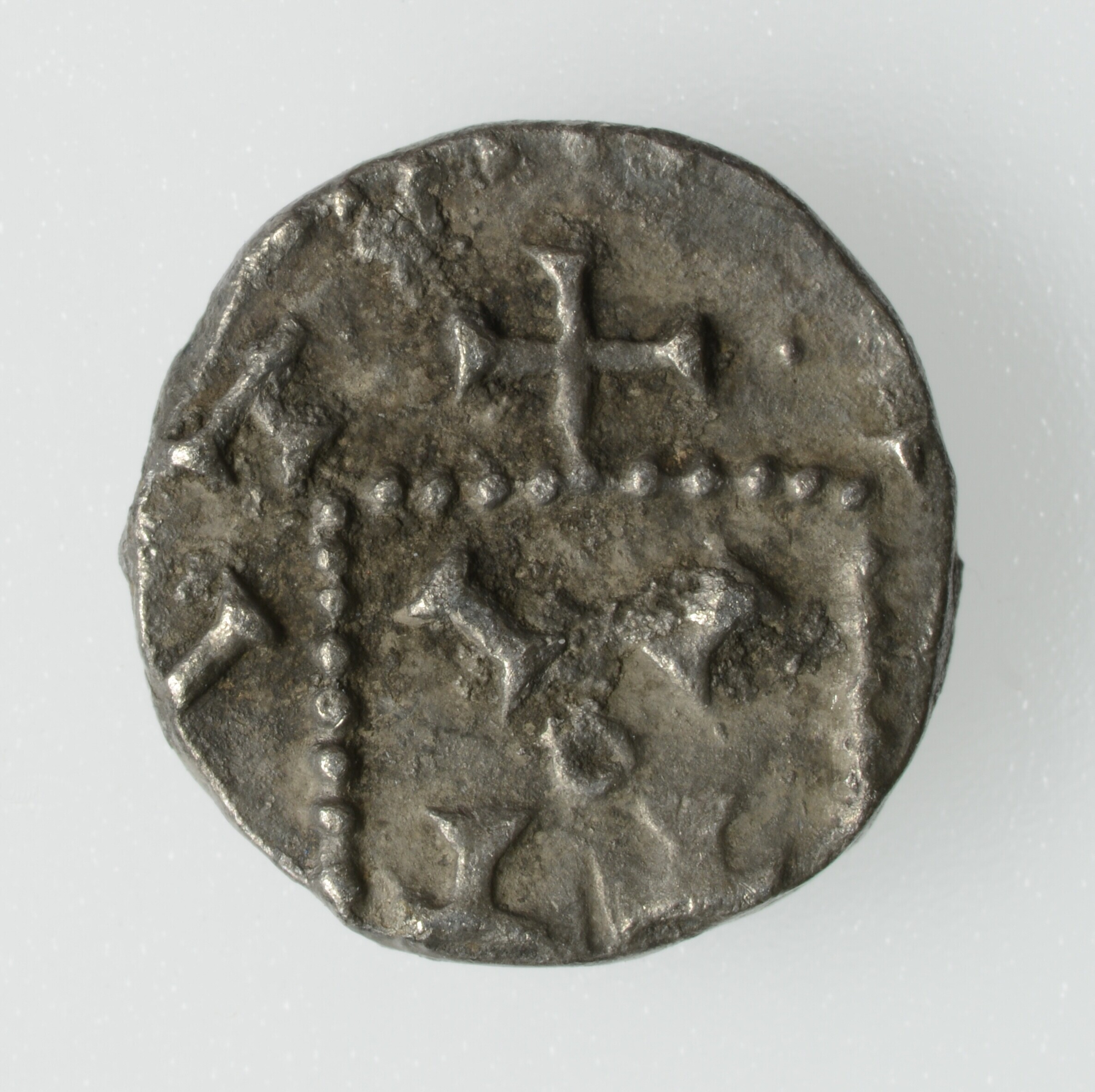 Sceatta BMC type 2b; vz: kop kijkend naar rechts; kz.: kruis met daaronder een vierkant patroon met puntjes; gewicht: 1.13 gram