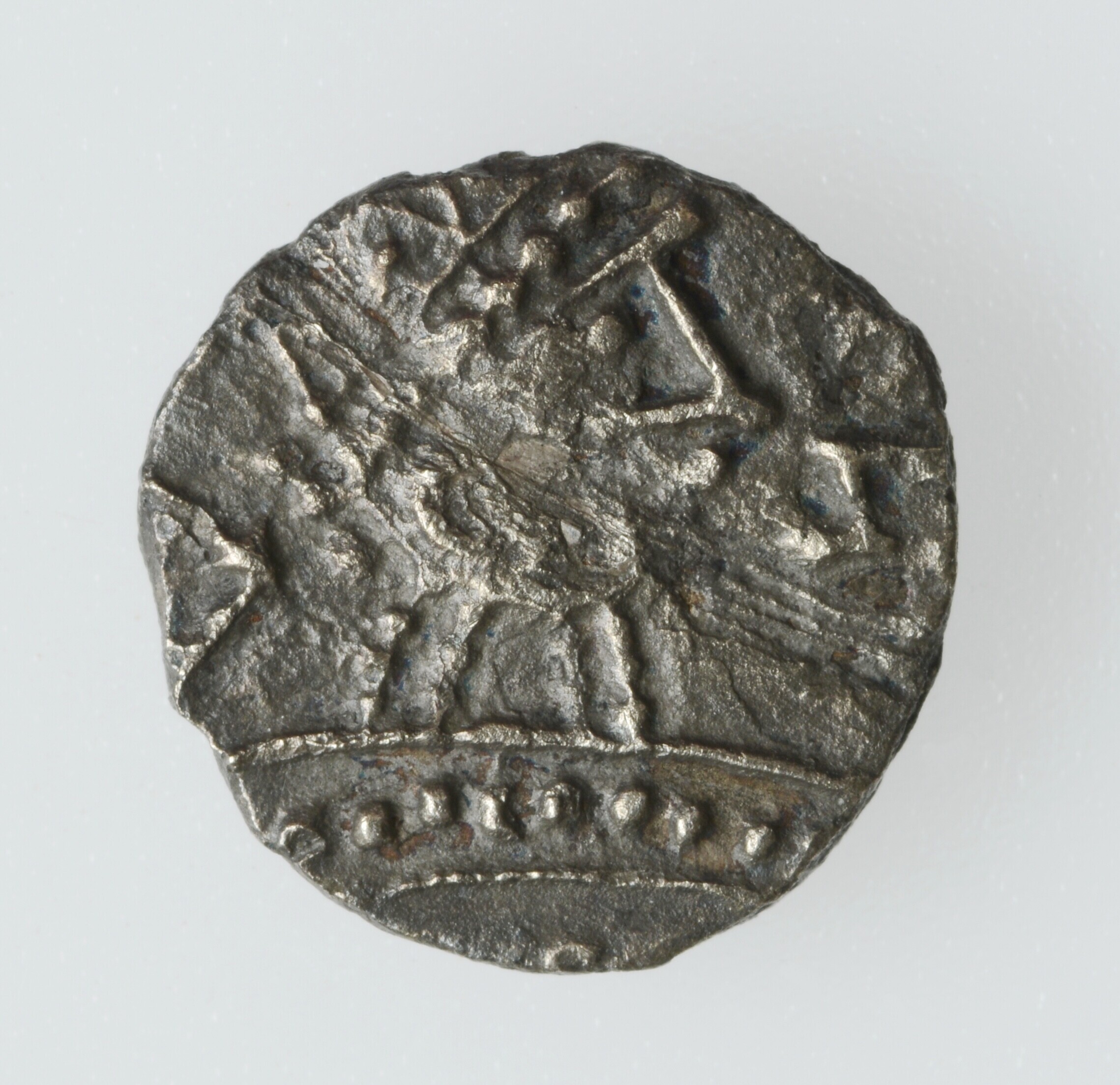 Sceatta BMC type 2b; vz.: kop kijkend naar rechts; kz.: vierkant patroon met vier letters T (?) binnenin; gewicht: 0.67 gram