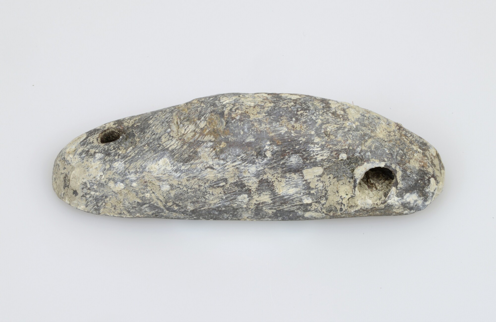 Gewicht; halfrond met platte bodem en twee doorboringen; gewicht: 584 gram; vondstgegevens: vak 9, vondstdatum: 13-2-2007