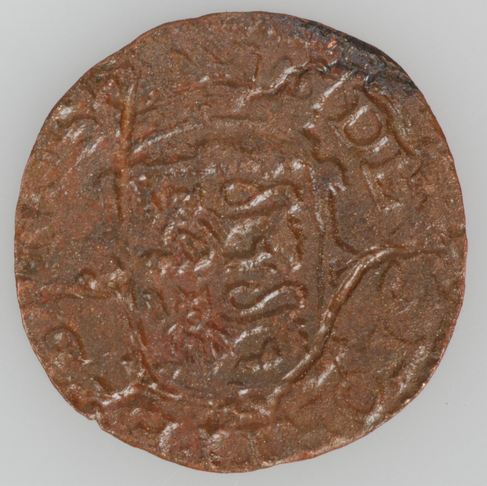 Duit West Friesland; vz.: een tulpkrans met daarin de tekst WEST FRISIAE in twee regels, daaronder het jaartal 1627; kz.: gekroond wapenschild met het wapen van West-Friesland, de leeuwen hebben hun kop 'en face' gericht, randtekst: DEVS. FORTI. ET. SP. NOS. Dit is voluit: Deus fortitudo et spes nostra, en betekent: God is onze kracht ...