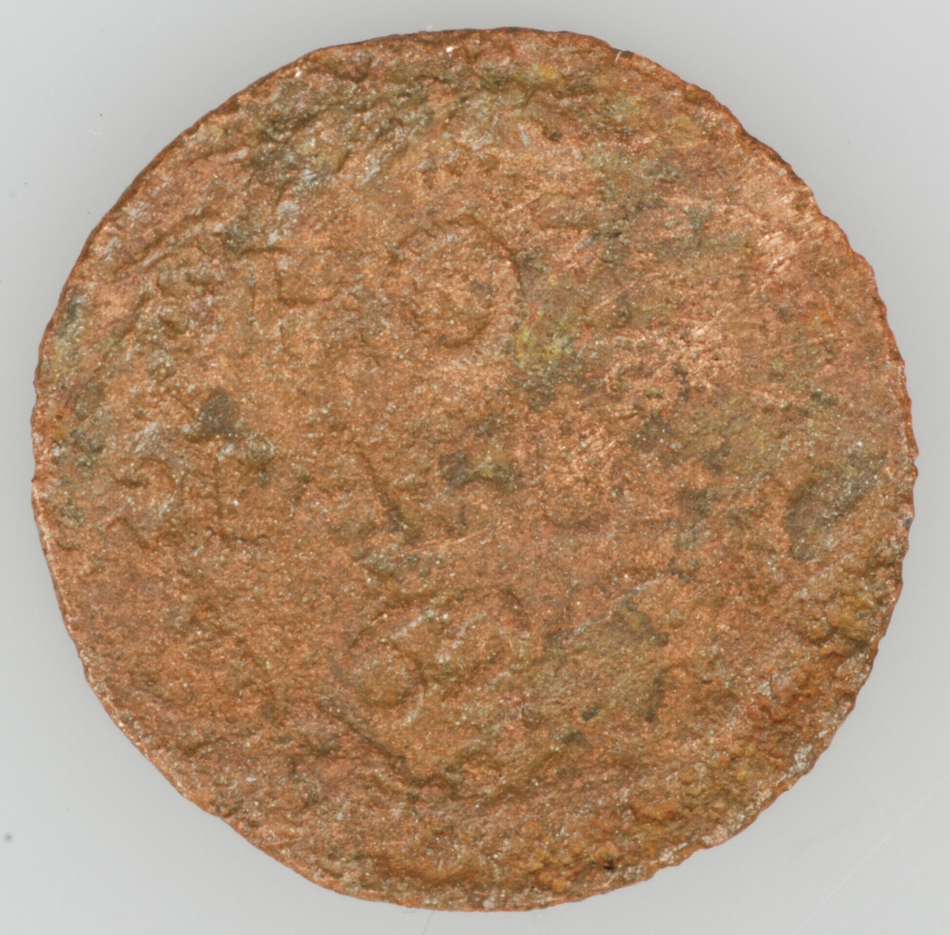 Duit Hollandia; vz.: een tulpkrans met daarin de tekst HOL LANDIA in twee regels en daaronder het jaartal 1626; kz.: onleesbaar; gewicht: 1.85 gram; vak 1; vondstomstandigheden: metaaldetector