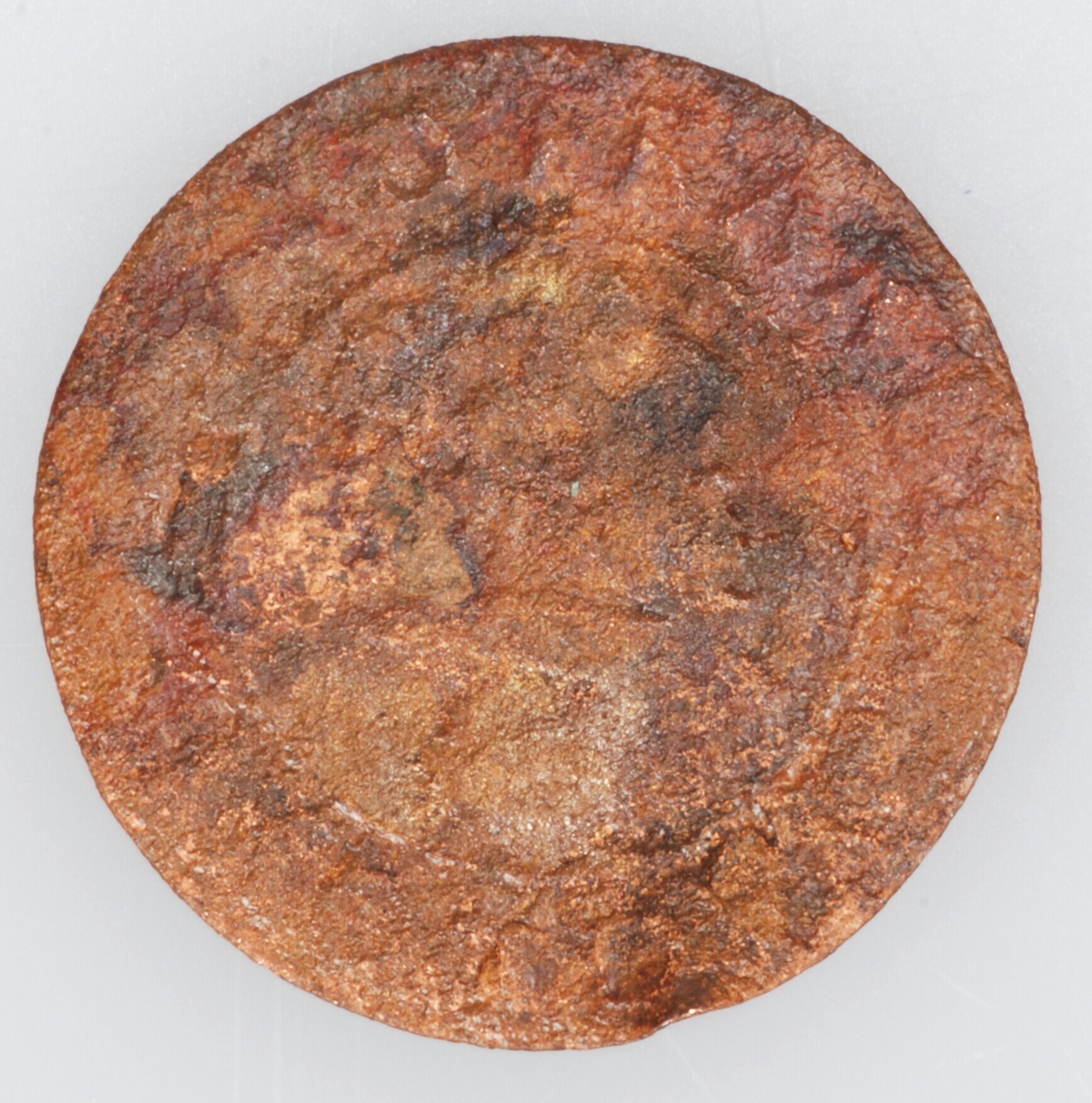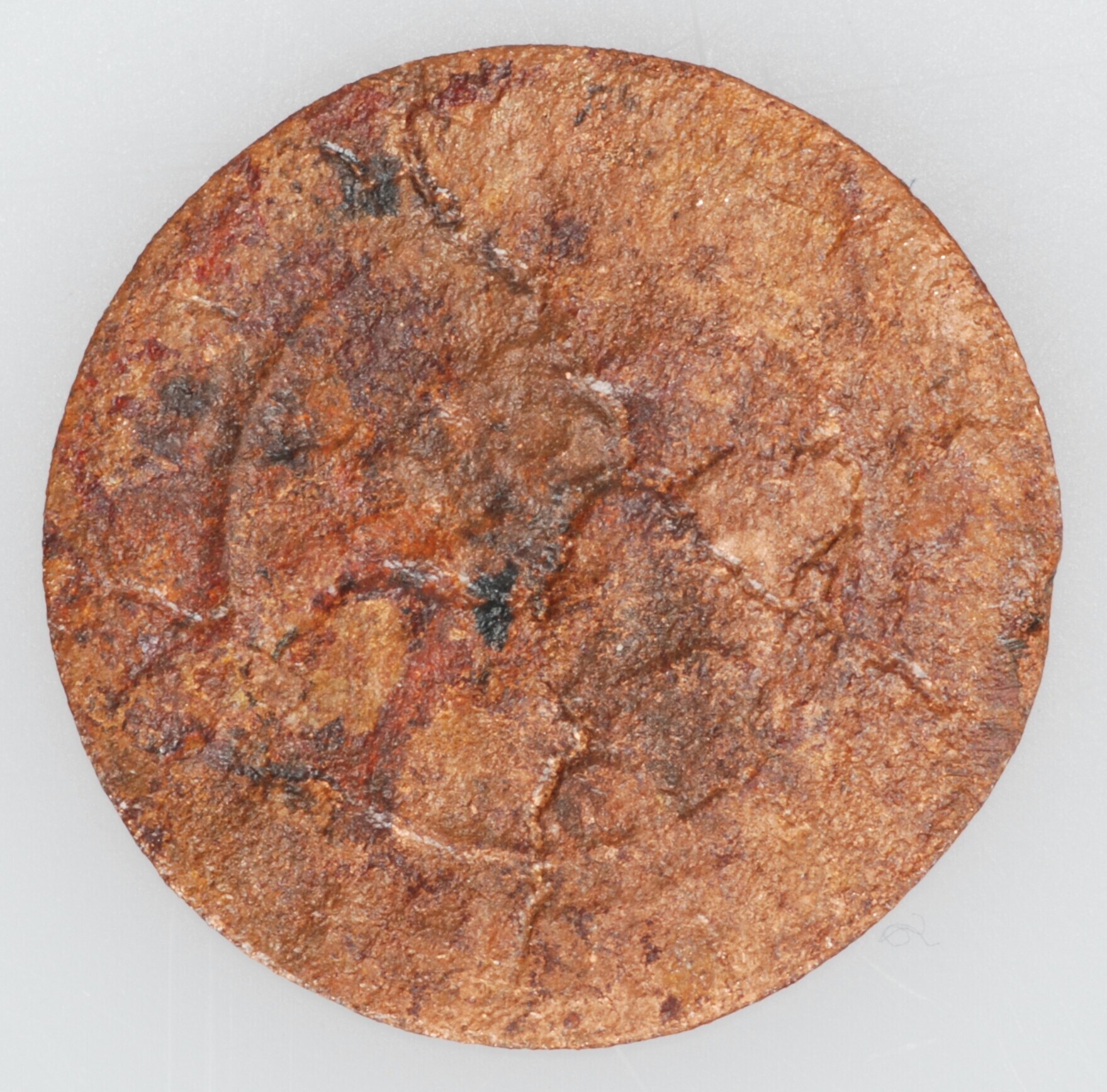 Double Tournois Gaston d'Orléans; Frankrijk; vz.: buste van Gaston d'Orléans kijkend naar links, randtekst: GASTON VSV D LA SOV DOM G; kz.: 3 franse lelies met daarboven een weegschaal, randtekst onleesbaar; gewicht: 1.10 gram; datum: 13-02-2007; vak 9; vondstomstandigheden: verdiepen vlak tot 3,85m