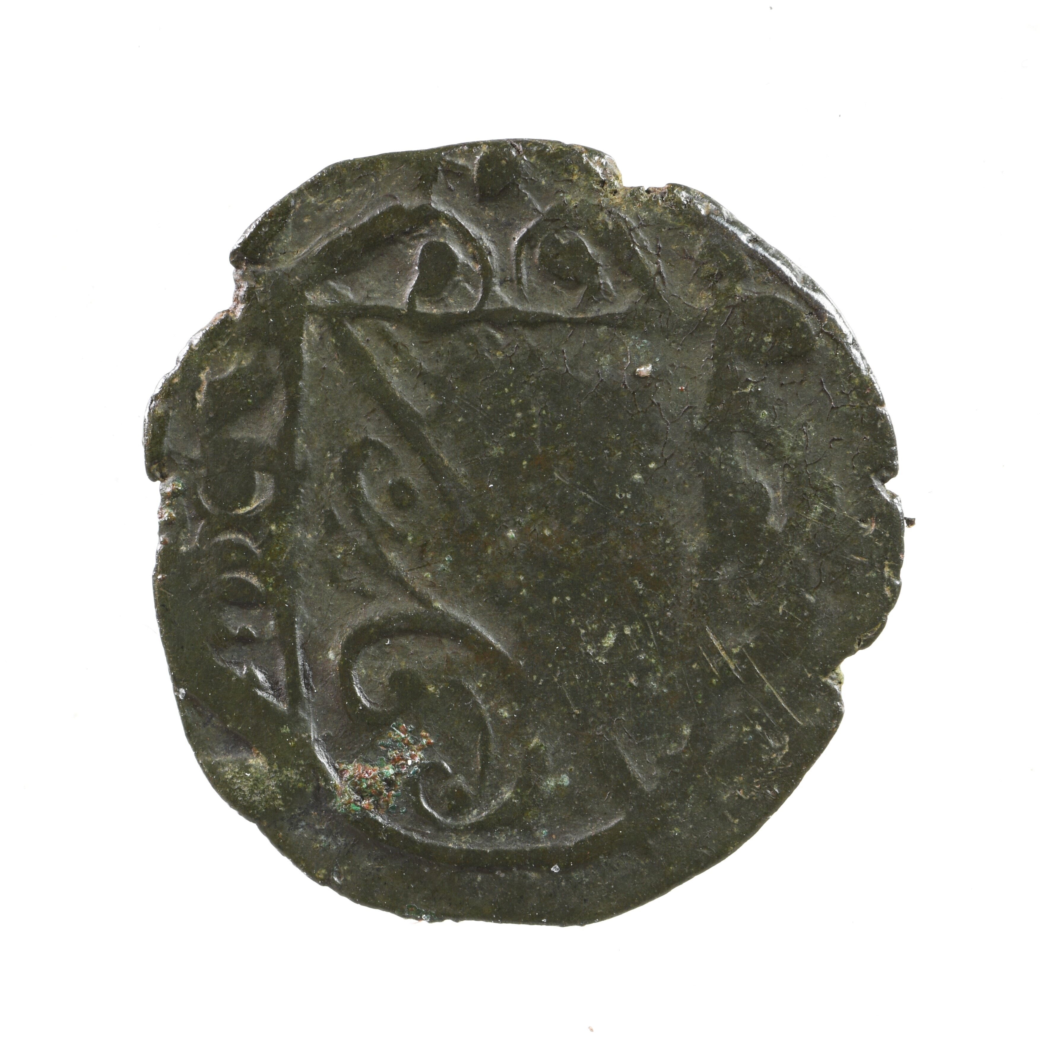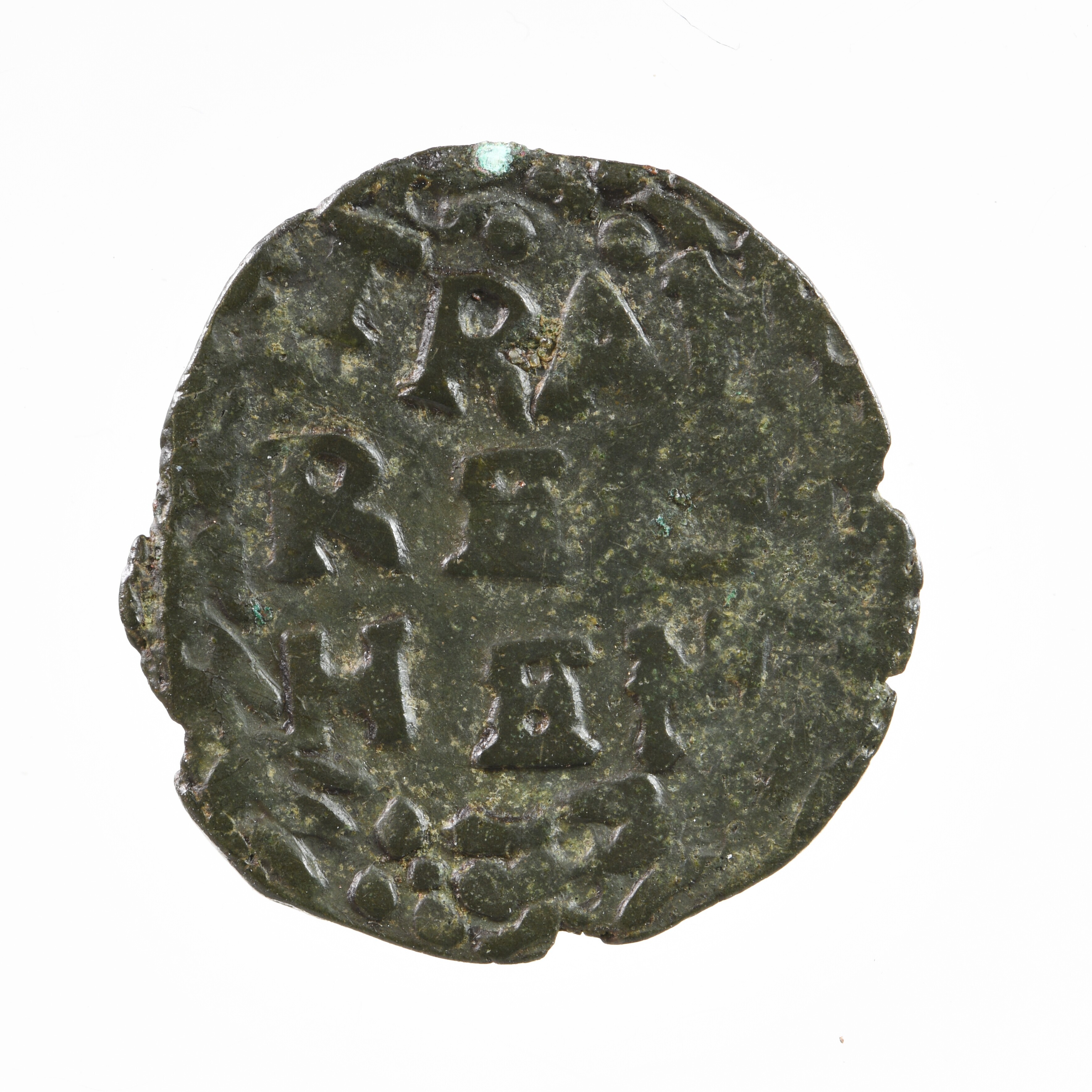 Duit Reckheim; vz.: in drie regels TRAM / REC / HEM binnen tulpenkrans; kz.: imitatie van het wapenschild van Utrecht; gewicht: 1,40 gram